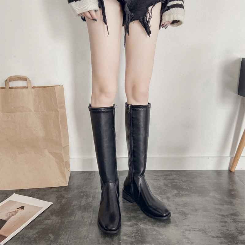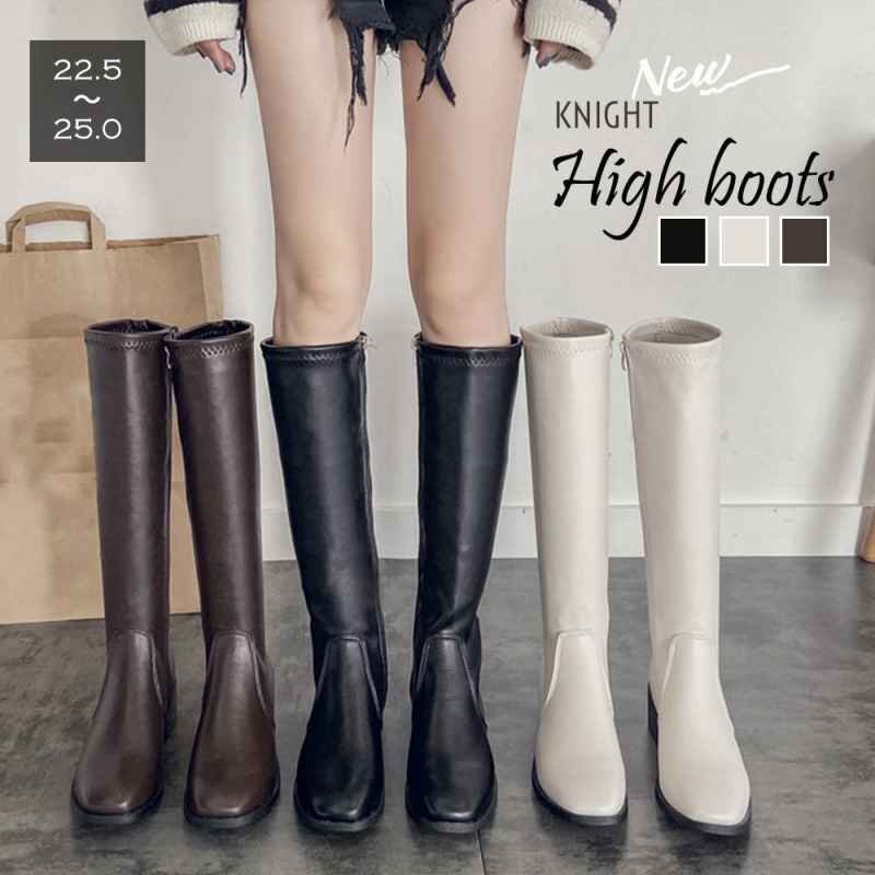 ニーハイブーツ レディース ロング丈 スクエアトゥ ローヒール 合皮 レザー調 22.5cm(35) ブラウン