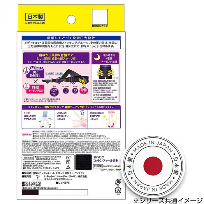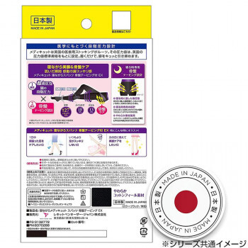 | 医学にもとづく段階圧力設計。メディキュットは英国の医療用ストッキングがルーツ。その圧力数値は、英国の圧力値標準規格をもとに設定。はくだけで、脚をキュッとひきしめ軽くします。 【使用上の注意】 1.重度の血行障害がある方は使用しないでください。 2.次の方は着用前に医師にご相談ください。 糖尿病、深部製脈血栓症、血行障害、うつ血栓心不全、炎症性疾患、装着部位の神経障害などで治療を受けている方。 3.着用にあたり、次のことを注意してください。 (1)サイズが合わないものや2枚重ねての着用はしないでください。 (2)使用中にしわやたるみができないようにしてください。 (3)ひざ下、ひざ裏で生地が丸まらないように伸ばしてください。口ゴムは折り返さずまっすぐのままはいてください。 4.気分が悪くなったり、痛みやしびれなどの不快感、かゆみ、、発疹等異常を感じた場合は直ちに使用を中止してください。 5.製品の変形を防ぐために、ねじれた状態でのご使用や保管をしないでください。 |