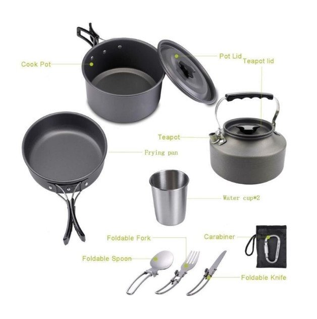 大きめの鍋、フライパン、ティーポット、304ステンレスカップ2個、フォーク、スプーン、テーブルナイフ、ロックを含む2~3人用の鍋セットです。アルミニウム合金製で、表面処理が施されています。高温や摩擦に強い高硬度です。カトラリー、フォーク、スプーンは410ステンレス鋼で作られています。特別にカスタマイズされた、厳選された 304 ステンレス鋼のウォーターカップは、ティーポットに入れることができ、持ち運びが簡単です。