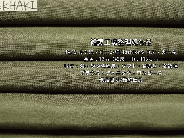 | 綿/シルク混 ローン調/fashionクロス 薄~やや薄 カーキ 12m | |