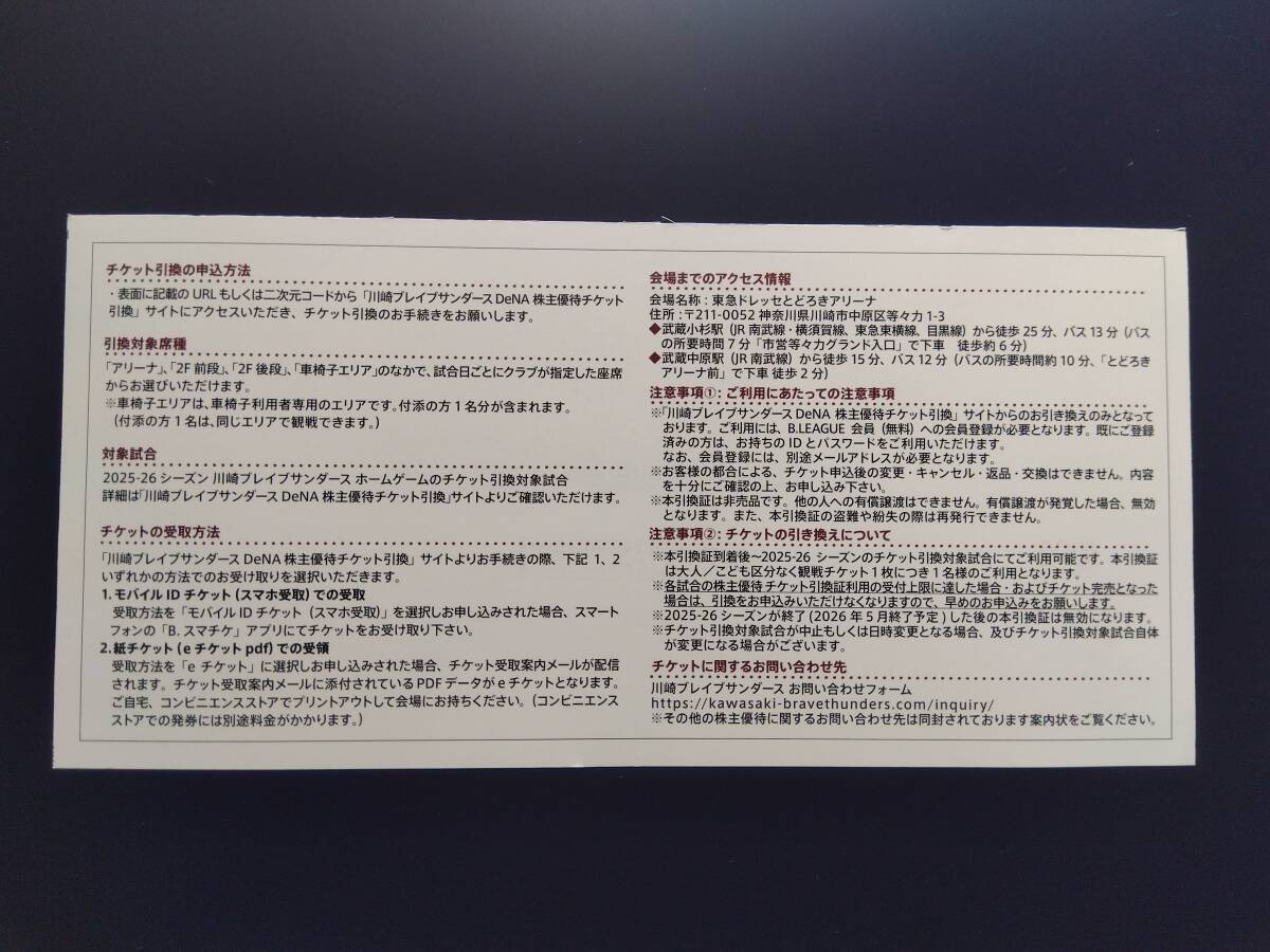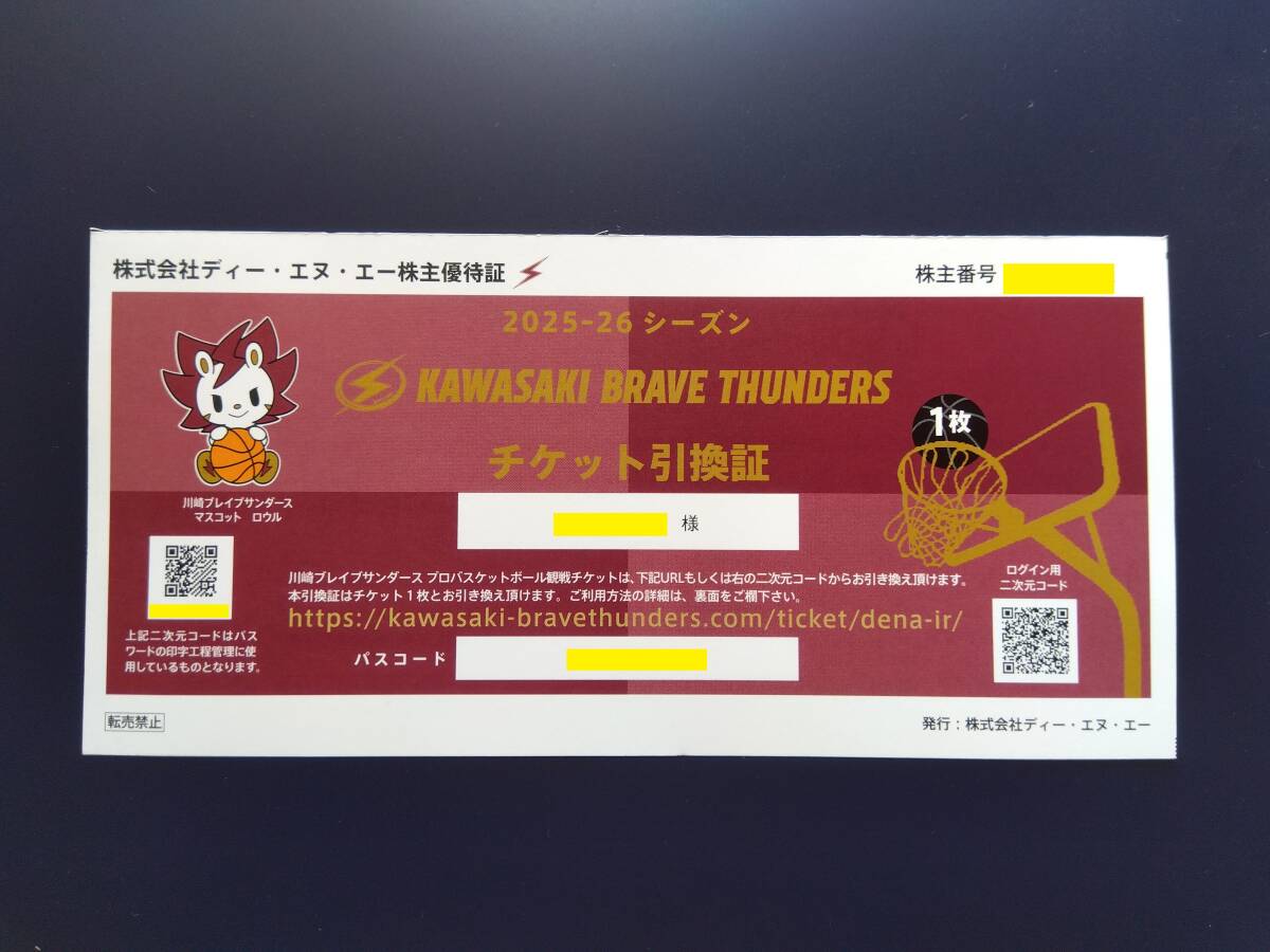 DeNA株主優待・川崎ブレイブサンダース チケット引換証 1枚(2025-26シーズン)男性名義