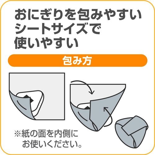 ●すべすべシート(シリコーン加工のグラシン紙)とアルミホイルを貼り合わせた「W(ダブル)シート」です。 ●内側のすべすべシートで、ごはんやのりがベトつかず、サラっとはがせます。 ●外側のアルミホイルで乾燥を防ぎます。 ●おにぎりを包みやすいシートサイズ(幅)です。