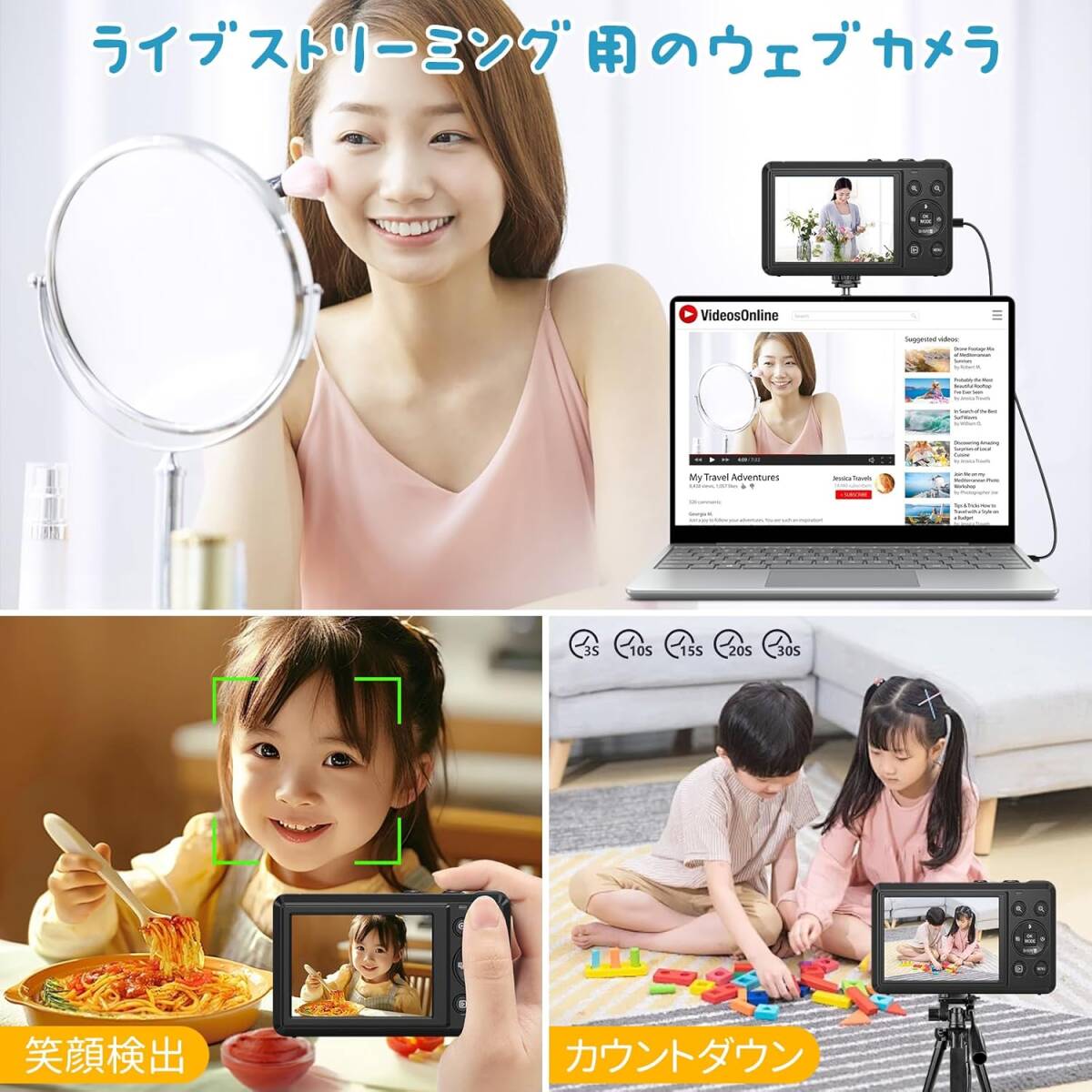 【ウェブカメラ&多機能の デジタルカメラ】このVlogカメラは機能が豊富で、USBケーブルでカメラをパソコンに簡単に接続でき、瞬時にウェブカメラに変身し、ビデオ通話やライブブロードキャストをために使用でき、オンラインでのインタラクティブな形式を大幅に豊かにします。充電したり、カメラから写真/動画を簡単にパソコンに転送したりすることもできます。それだけでなく、カメラにはたくさんの機能があります。
