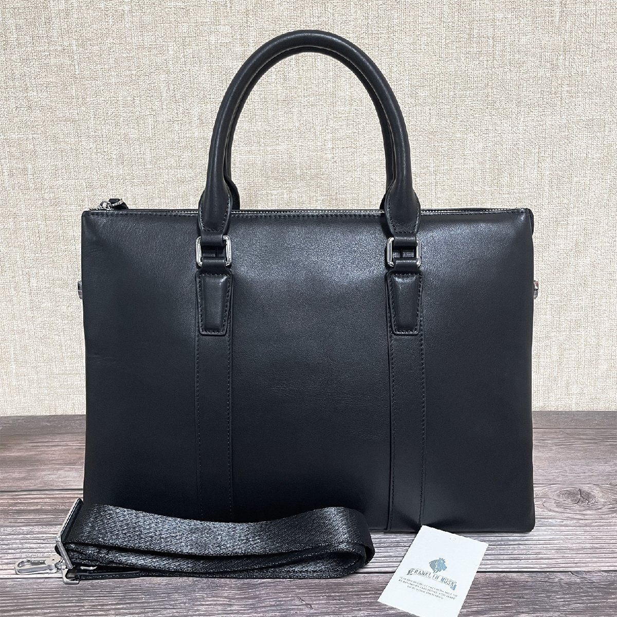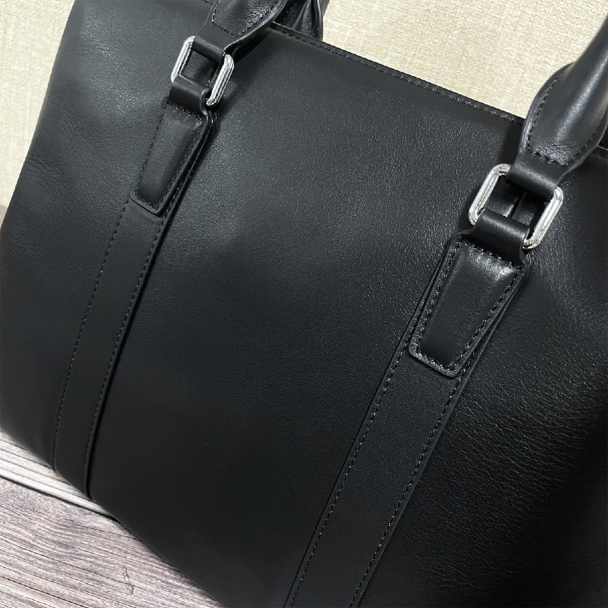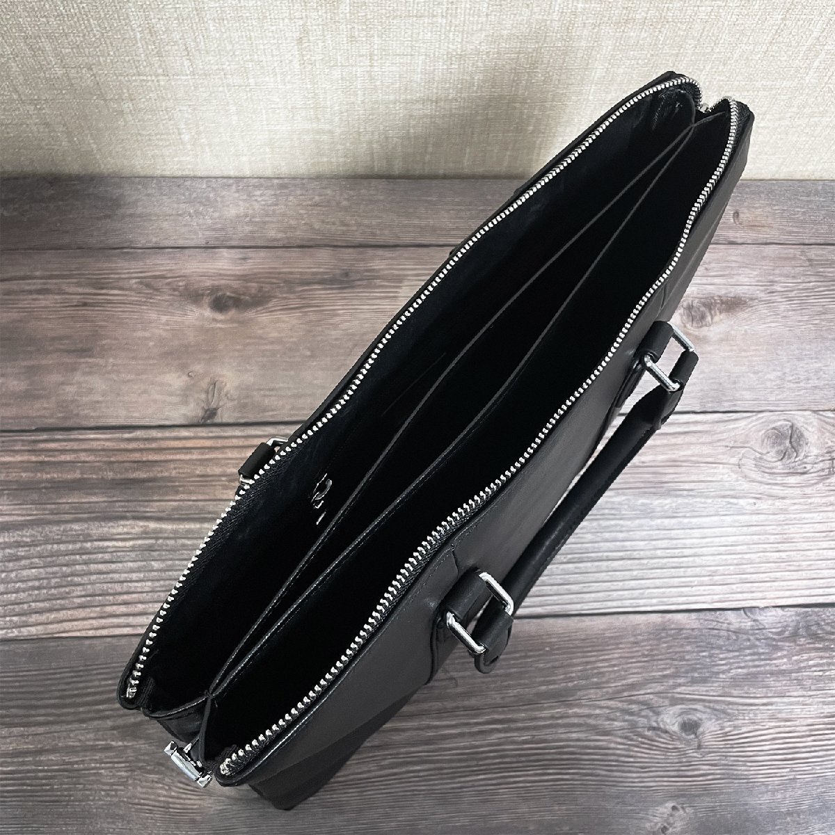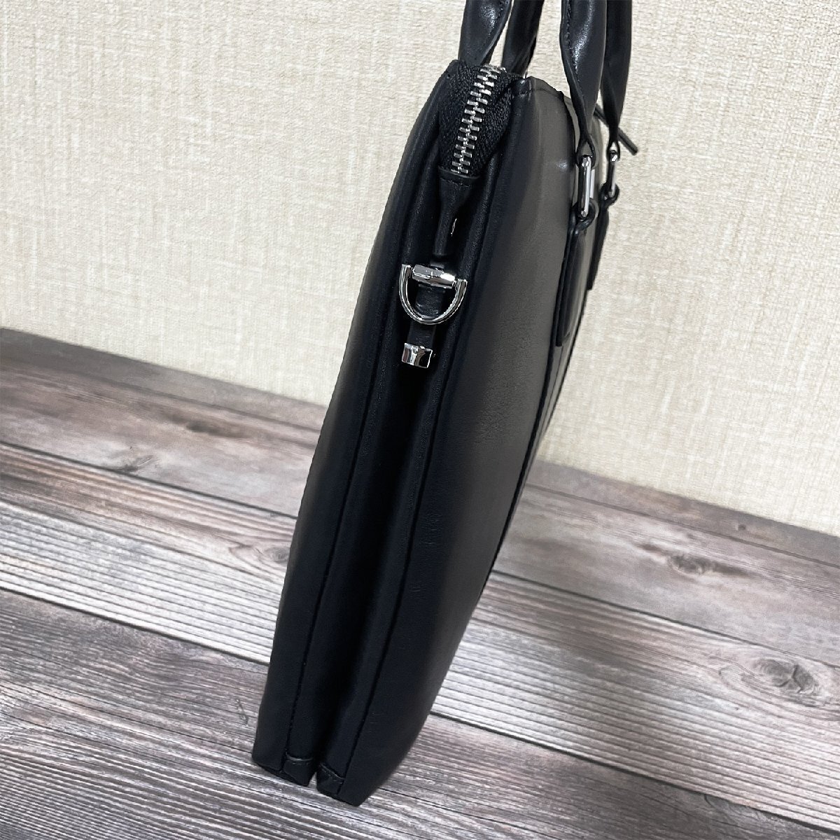 シンプルでスッキリとした実用的なデザインです。間口はファスナー式で、使いやすく、安心して物を取り入れることができ、中身が見えることもありません!両サイドに仕切りポケットがあり、内装にはファスナーポケットとオープンポケットが2つあり、機能性も十分!用途に合わせて資料や本を分けて入れられる十分なスペースがあります。持ち手はレザーで補強されており、重いものを入れても安心。フォーマルシーンにふさわしいスマートな雰囲気を演出します。