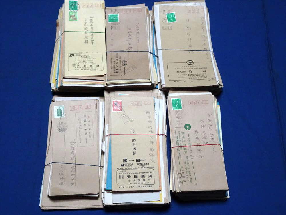定形郵便が50円時代に、新動植物国宝50円緑仏像が貼られた実逓便約800通です。一部に60円時代のものや、定形外の実逓便も混ざっています。今は存在しない事業者の宛先がかなり多く含まれており、またセロテープが貼られて変色したものもあります。