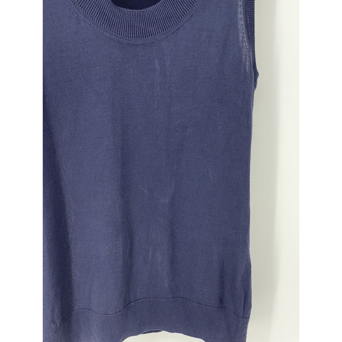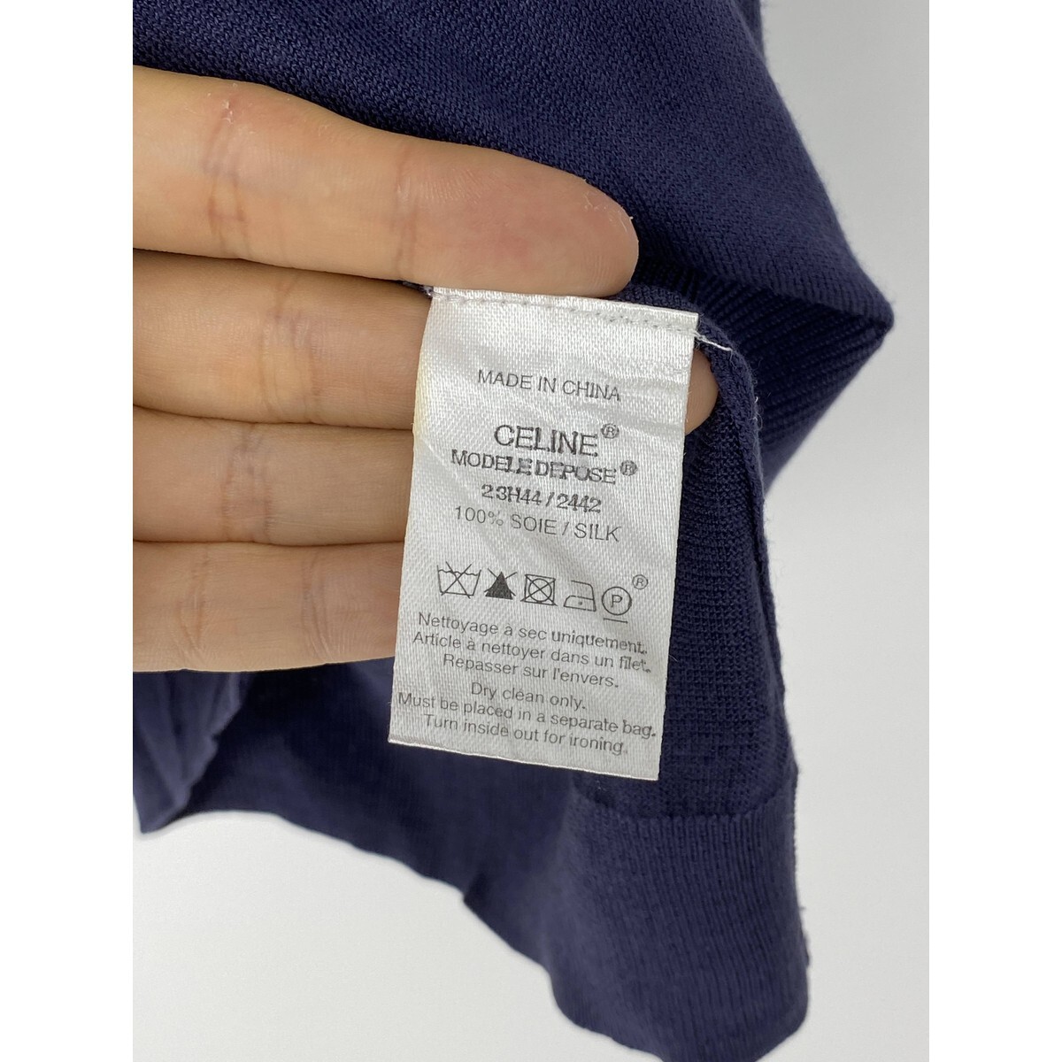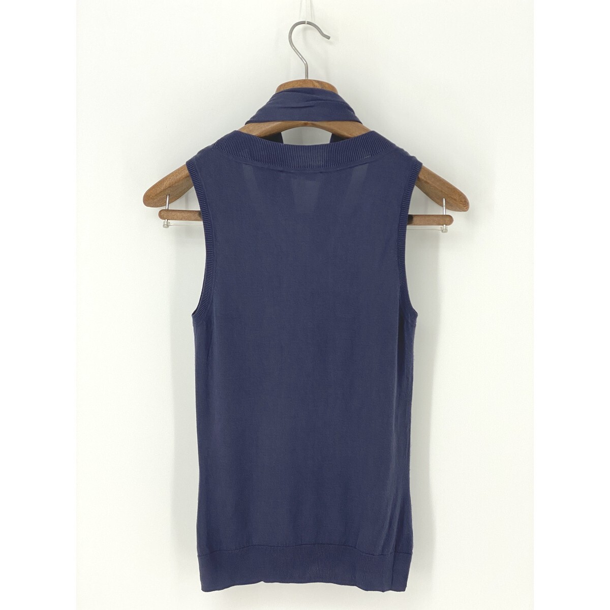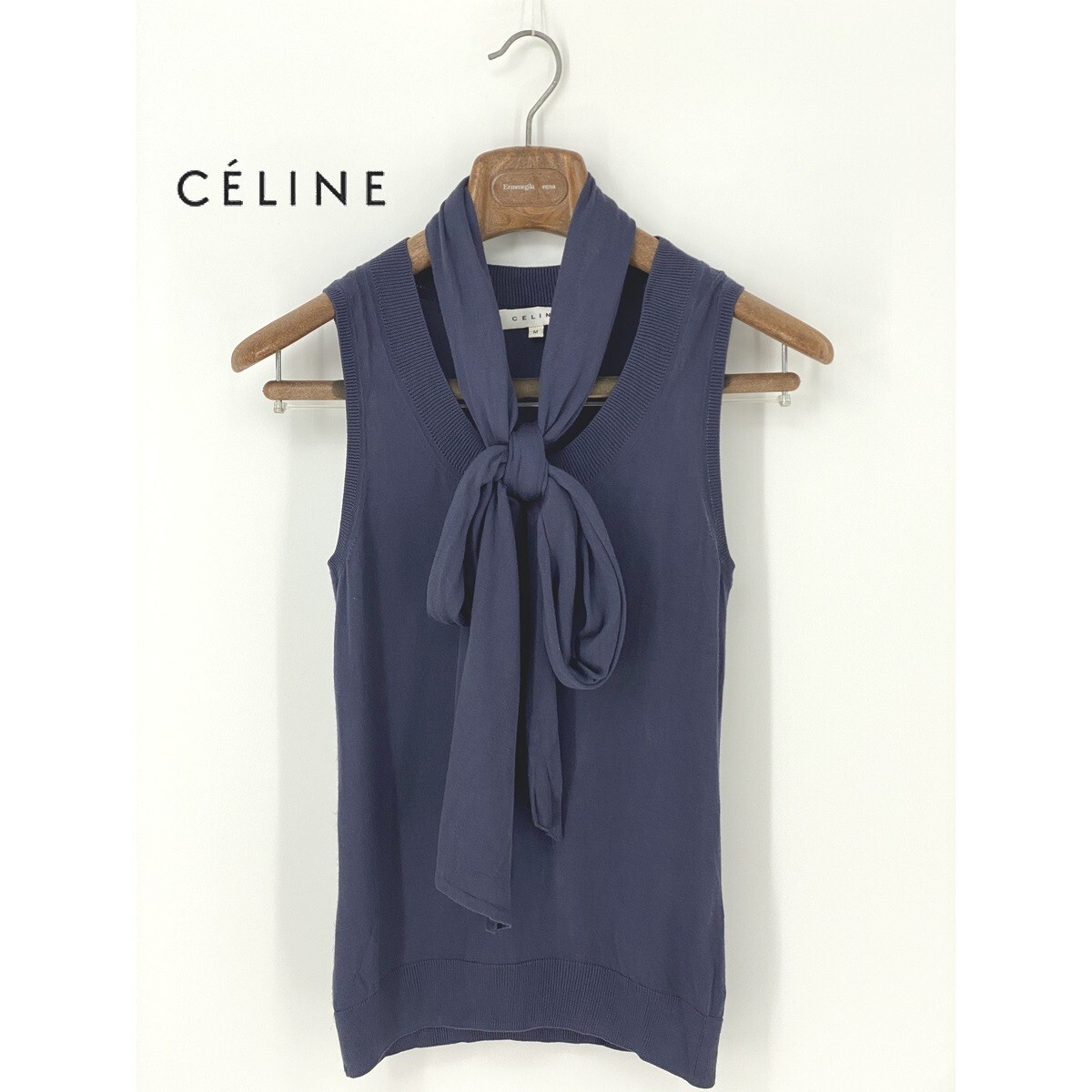 A8158/美品 春夏 CELINE セリーヌ 丸首 シルク100 リボンタイ ストール ノースリーブ ニット リブ セーター ベスト ジレ M 紺/レディース