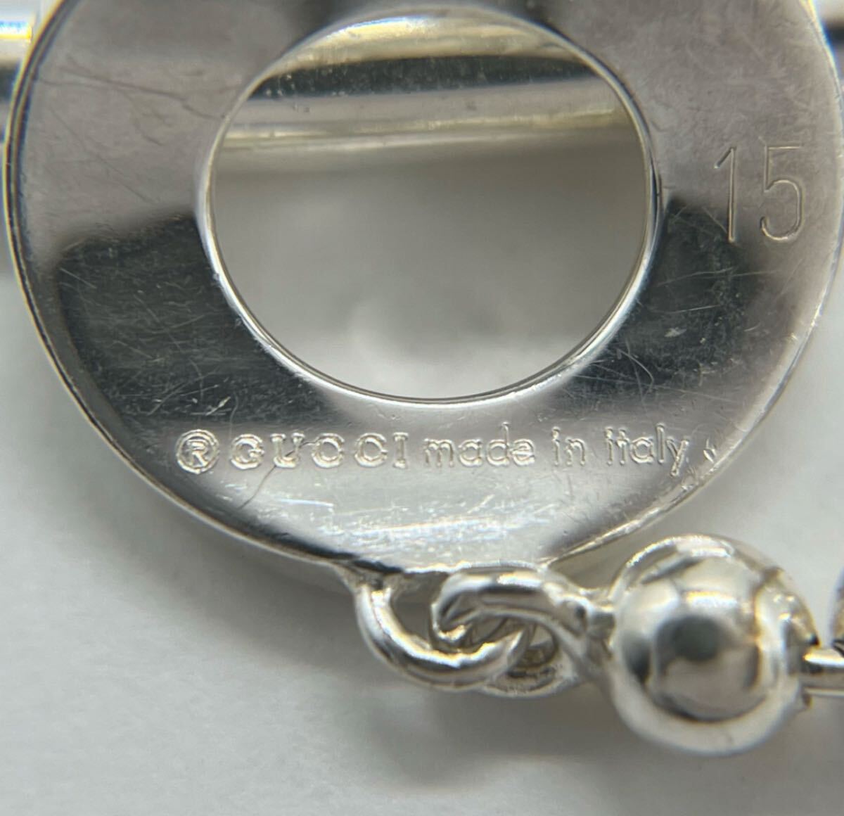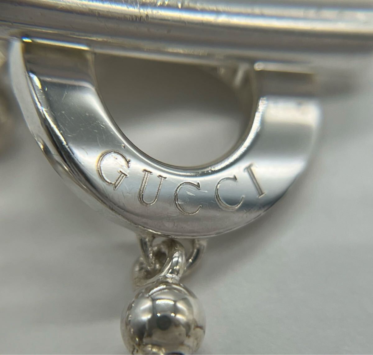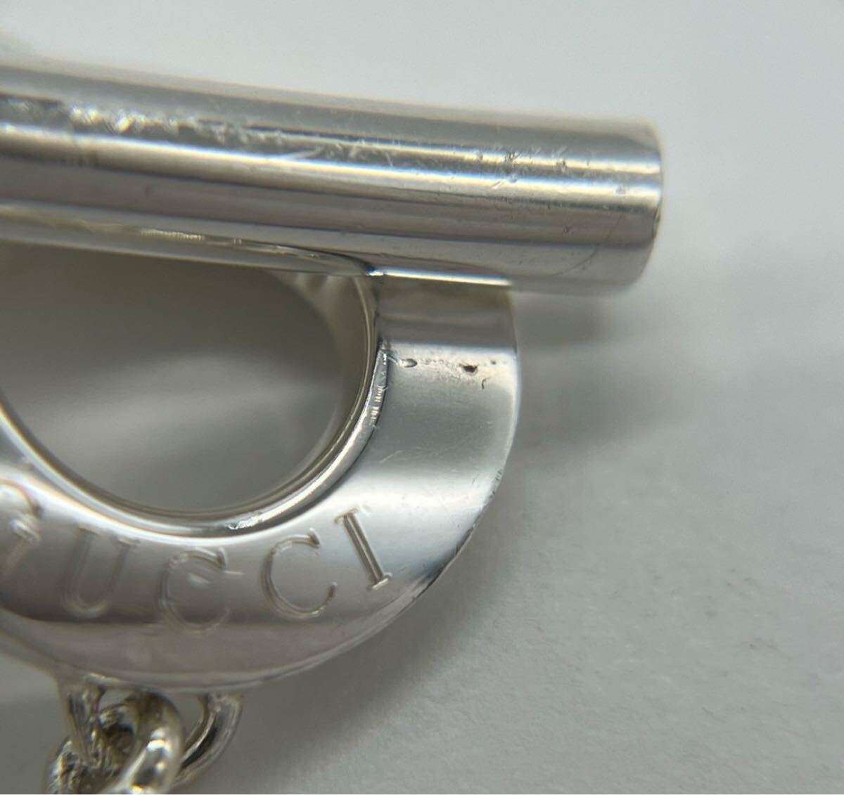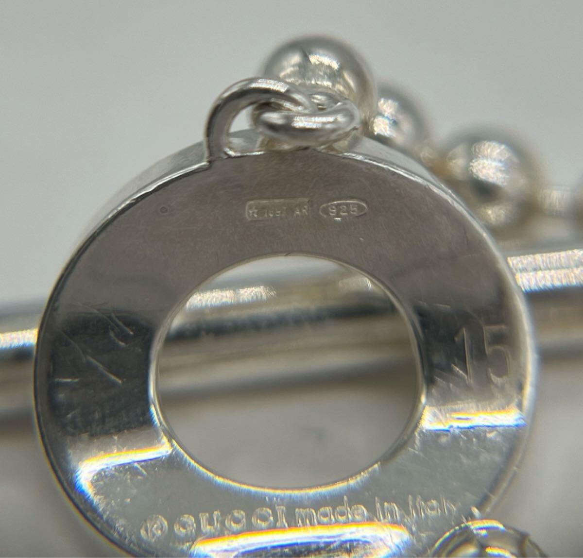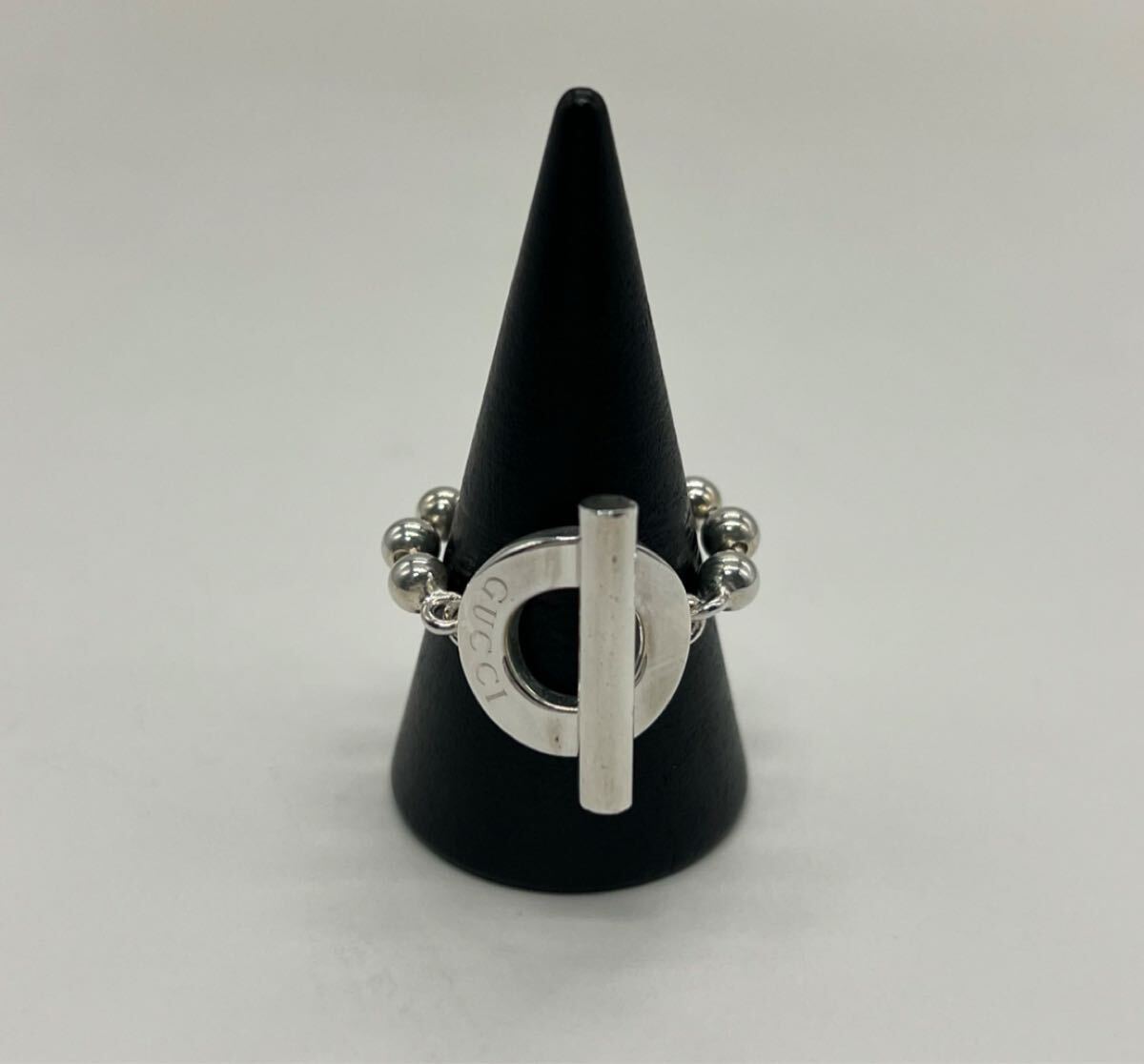 ブレスレットの留め具であるトグルモチーフがトップにデザインされており、グッチならではのデザイン性の高さは着用時に存在感を放つお品物でございます。
