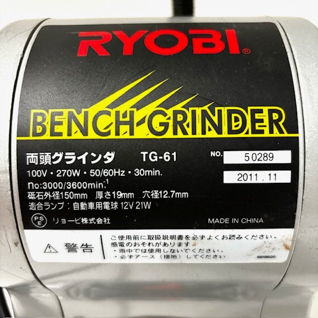 | RYOBI リョービ BENCH GRINDER 両頭グラインダ TG-61 2011年製 電動工具 工事 作業 No.50289 |