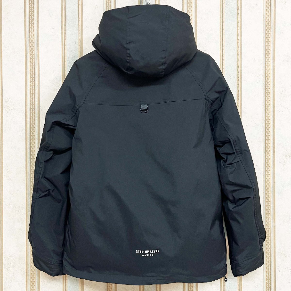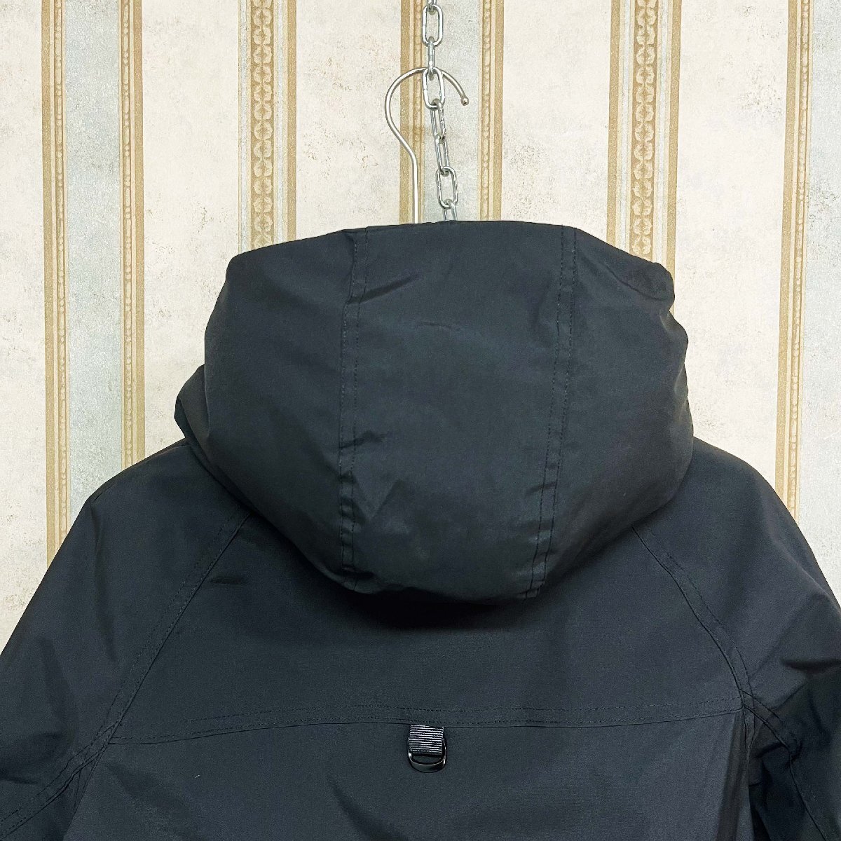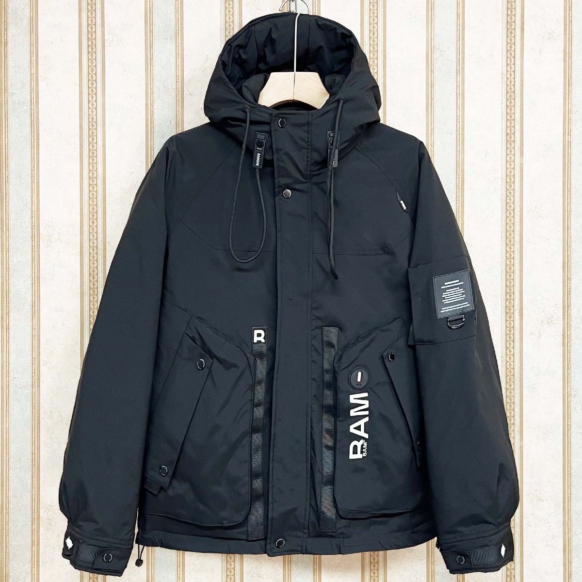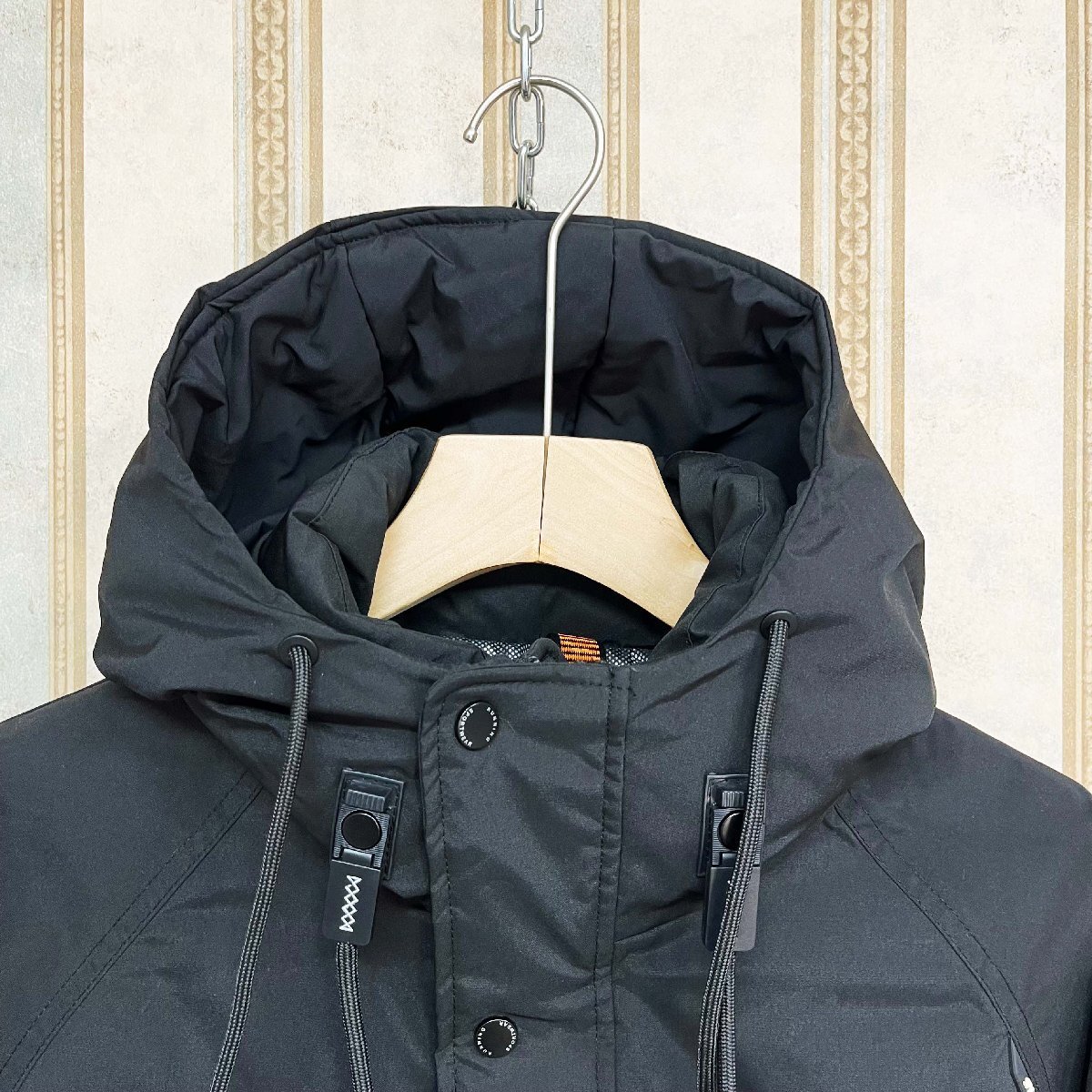 ダウンジャケットと一体のフードと裾には、ドローストリングが付いており、引き締めることで寒風の侵入を防ぐことができます。両サイドには大容量のジップポケットがあり、収納力が抜群です。内側には隠しポケットもあり、貴重品を安心して収納できます。左袖とバックの英字はポイントで、カジュアルスタイルがこなれ感のある印象に。