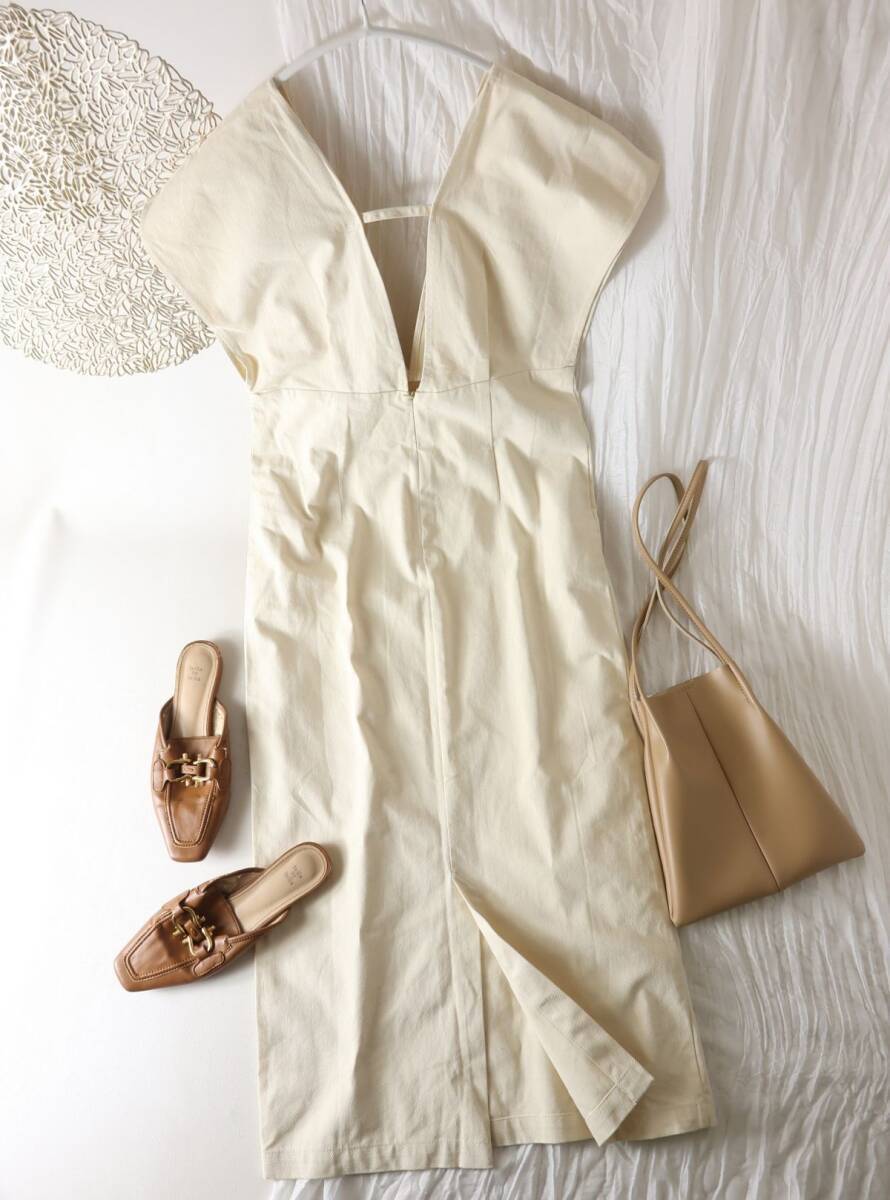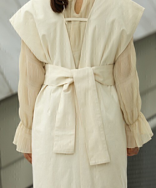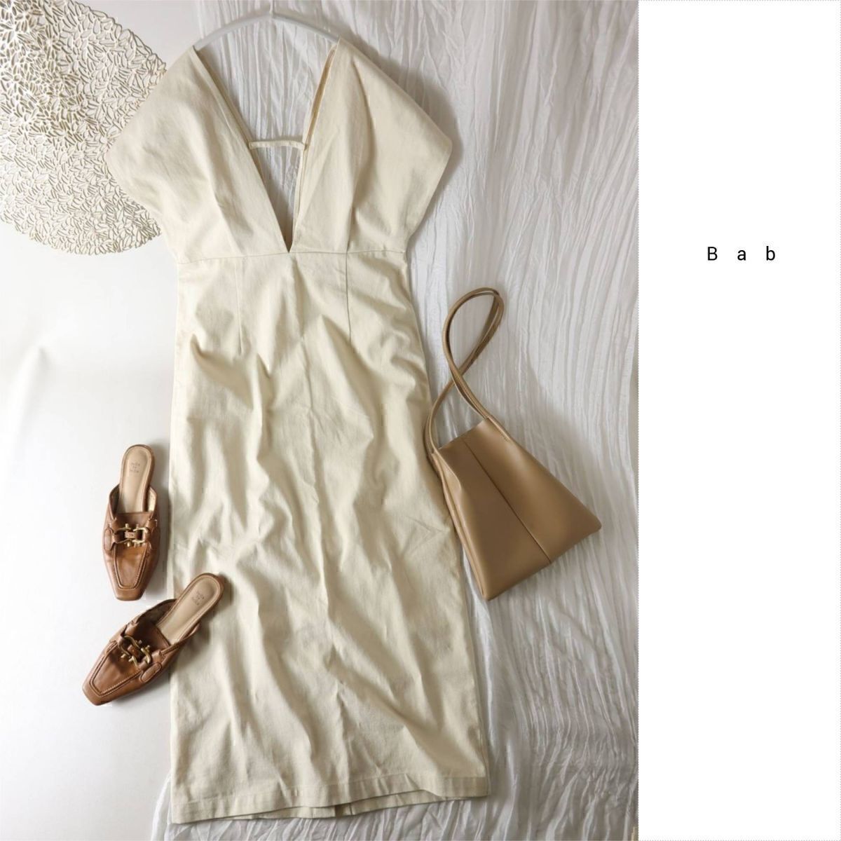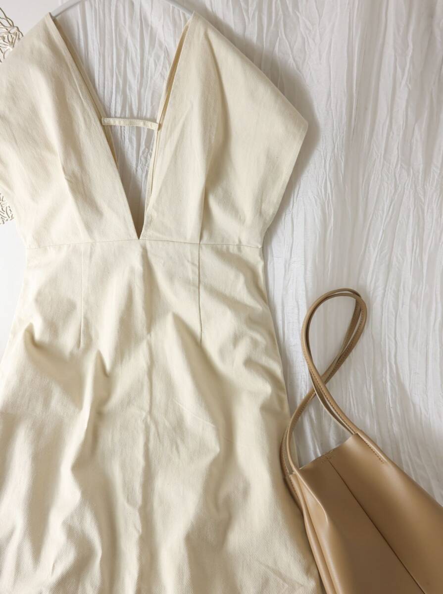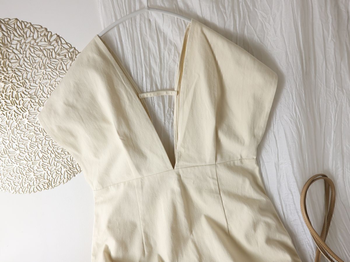 インに合わせるもので着こなしが変えられる便利なジャンスカ。シンプルなデザインなので、どんなインナーで合わせてもお洒落なコーデに仕上がります!大き目のVネックが首周りもスッキリ見せてくれます。ショルダー部分はしっかりと肩を覆うデザインで安心感も◎。バックスタイルには細めのラインを入れることでワンポイント、アクセントをつけています。 タイト目のスカート部分ですが、ヒップ周りにも程よくゆとりがあるので身体のラインが出ることなく、とても美シルエット。深めのスリットで足さばきも良いです。ウエストには取り外し可能のリボンがついており、気分によって取り外しできるので着こなしの幅も広がります!