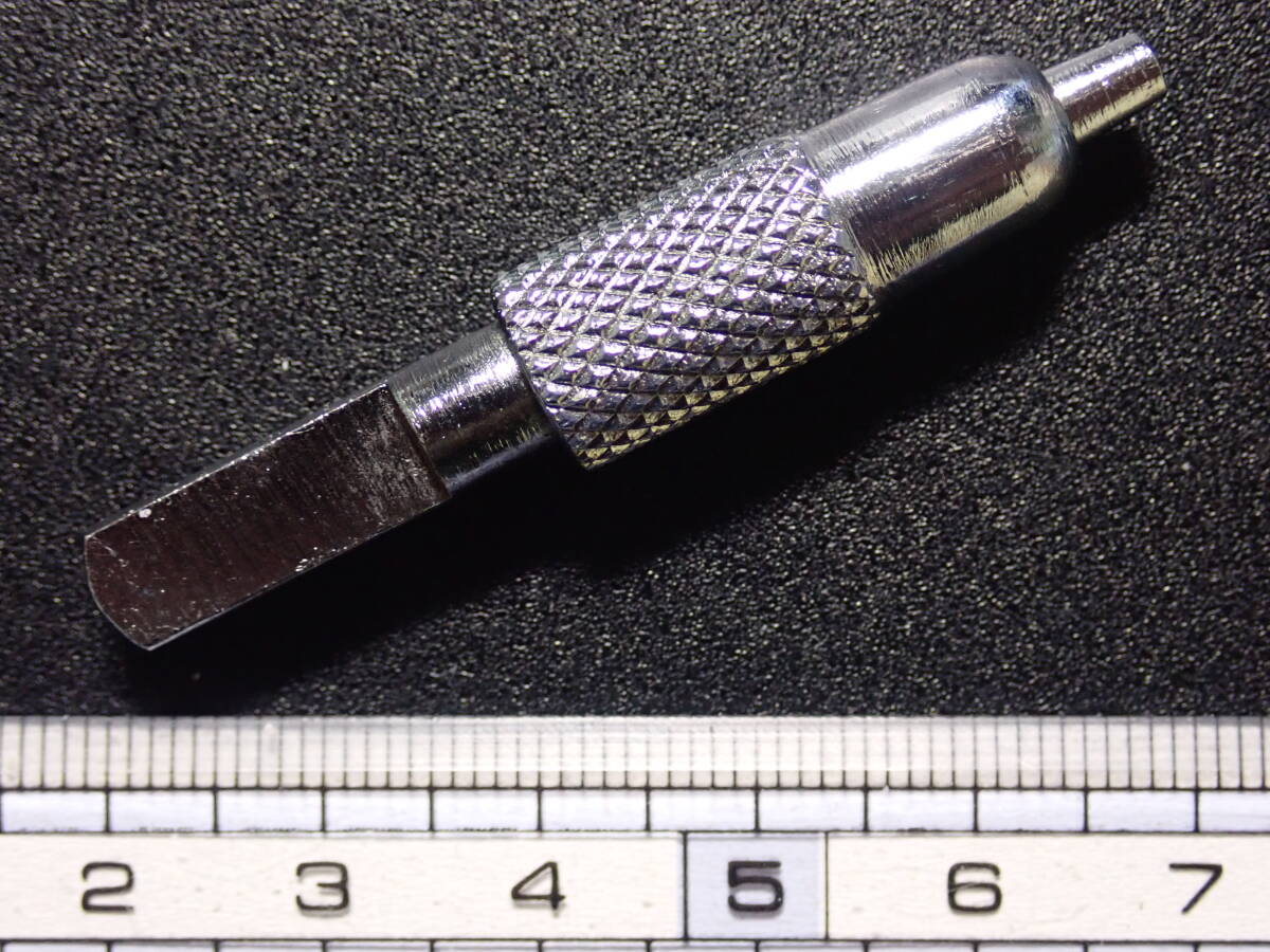 スタンダードな普通のバイスに、後端の平たい部分を挟んで、アダプターとして使います。旋盤目のある部分を回転させると、ジョーが開閉する仕組みです。