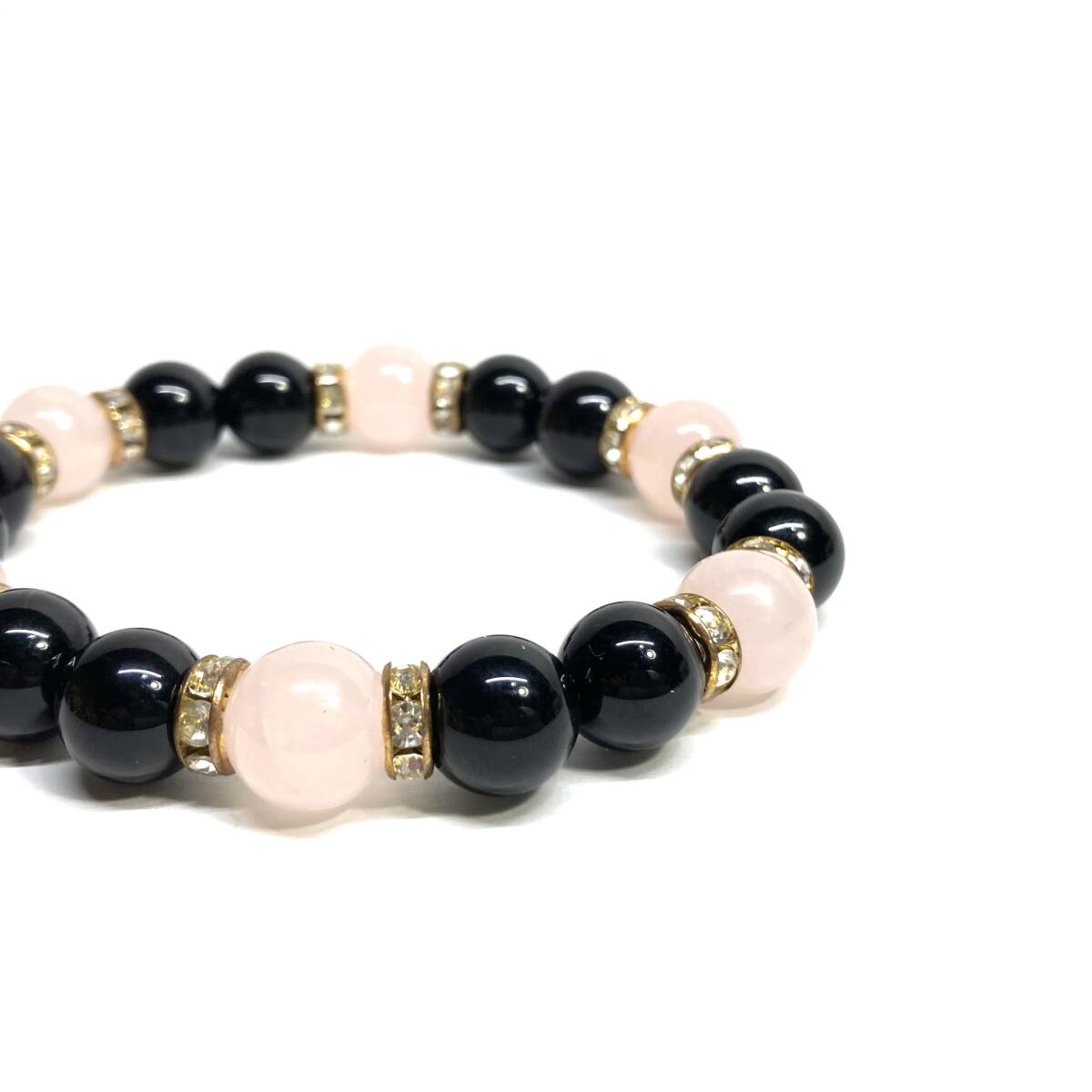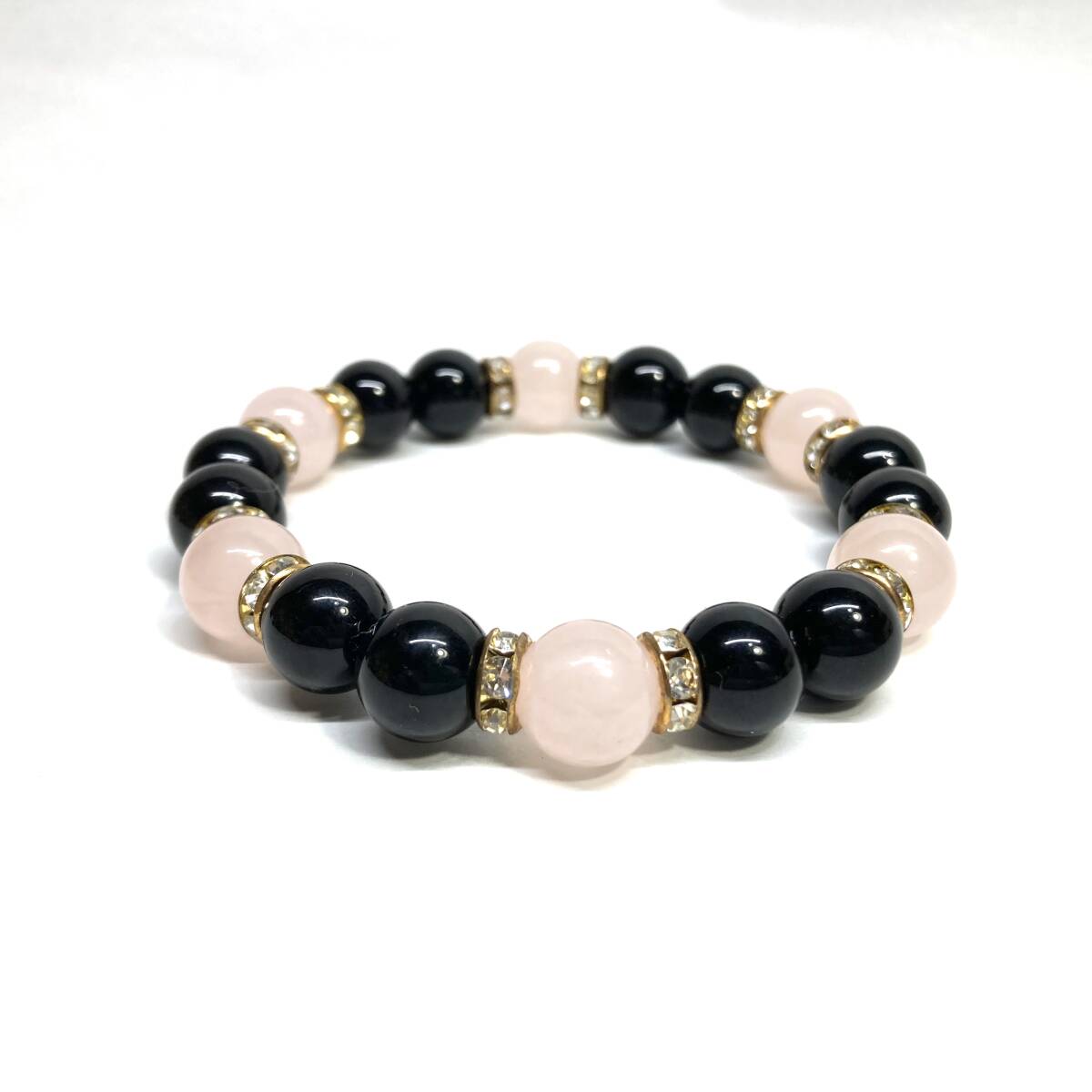 こちらは、モリオンとローズクォーツを組み合わせたパワーストーンブレスレットです。間にはロンデルを挟み高級感あるデザインに仕上げております。石大きさは腕にも馴染みやすいように10mm玉で内径約18cm(伸可能)です。(サイズ変更の場合は取引ナビにてご連絡をお願いします。) 数に限りがございますので気になる方はお早めにどうぞ。