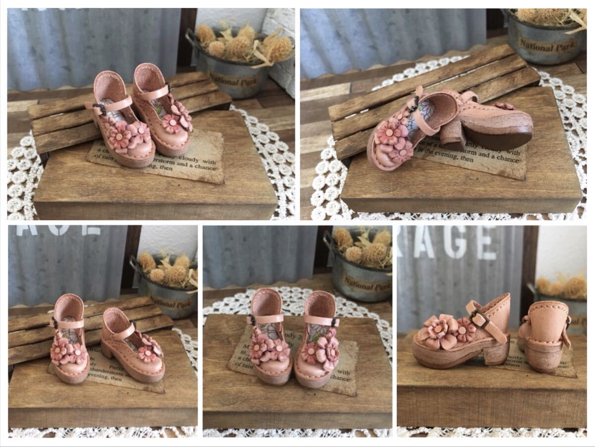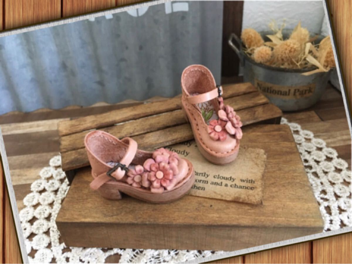 【素材/色】牛ヌメ革/ナチュラル お花は濃淡オールドローズ 靴底はカフェオレブラウン