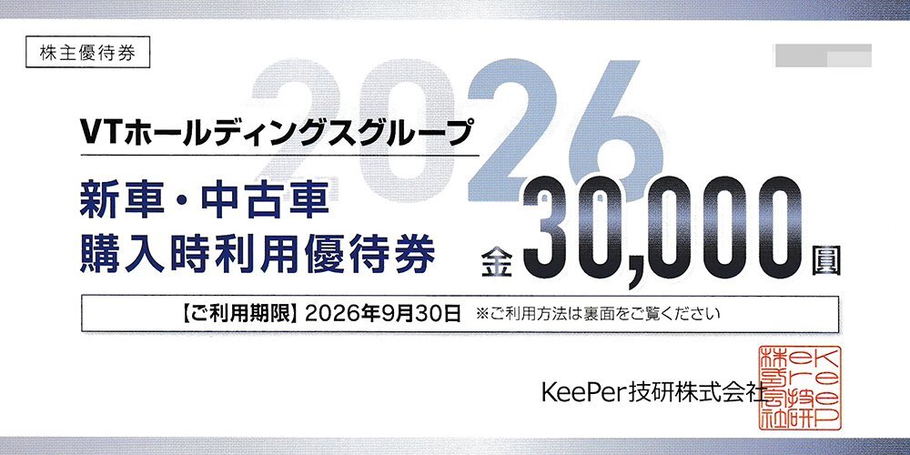 | 出 品 商 品 | KeePer技研 株主優待 キーパーLABO20%割引券×1枚+VTホールディングスグループ 新車・中古車購入時利用優待券30000円券×1枚 |