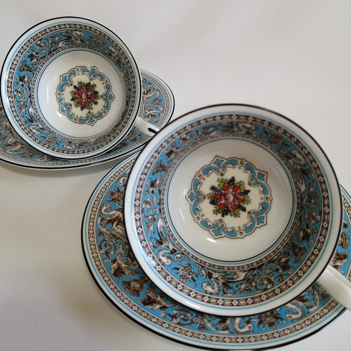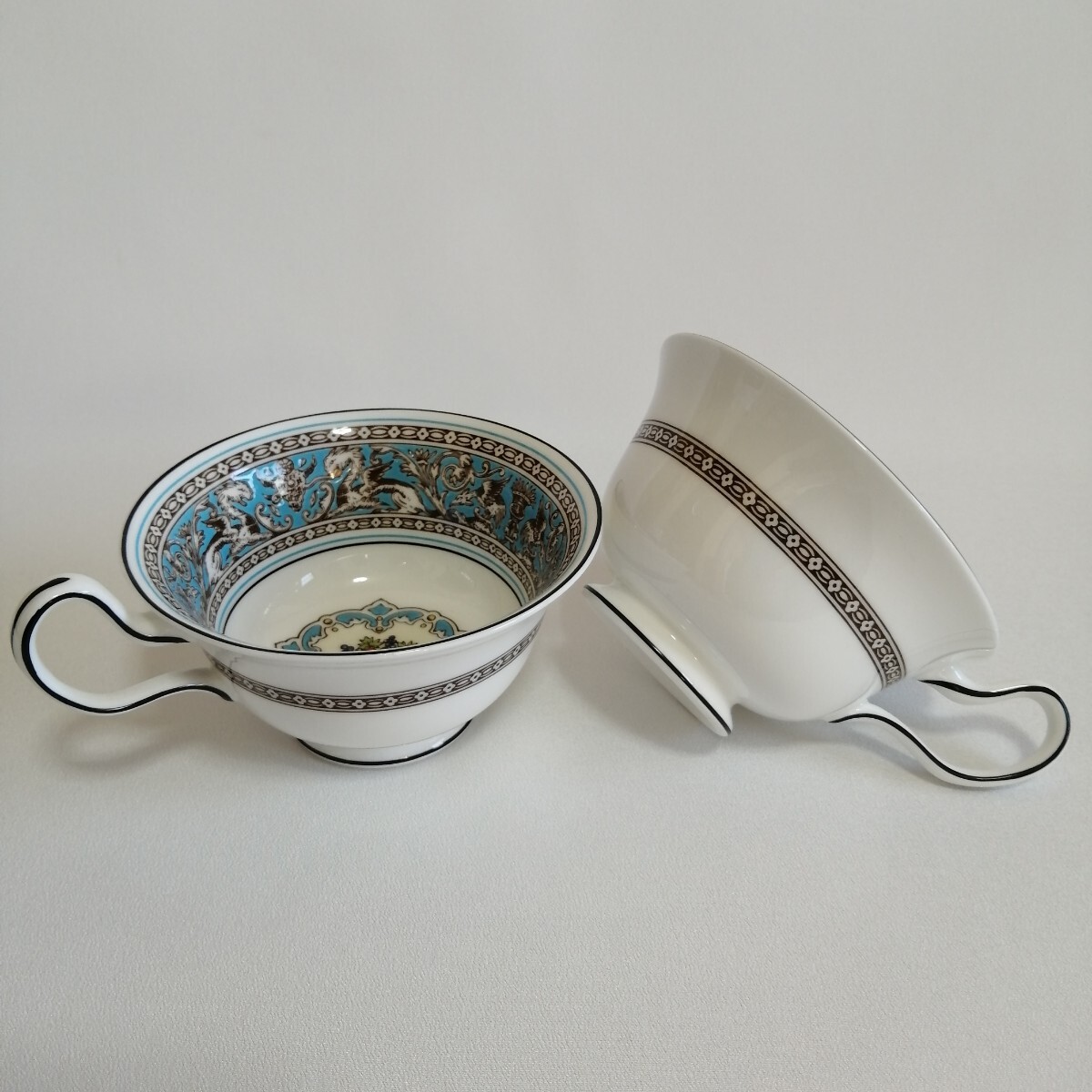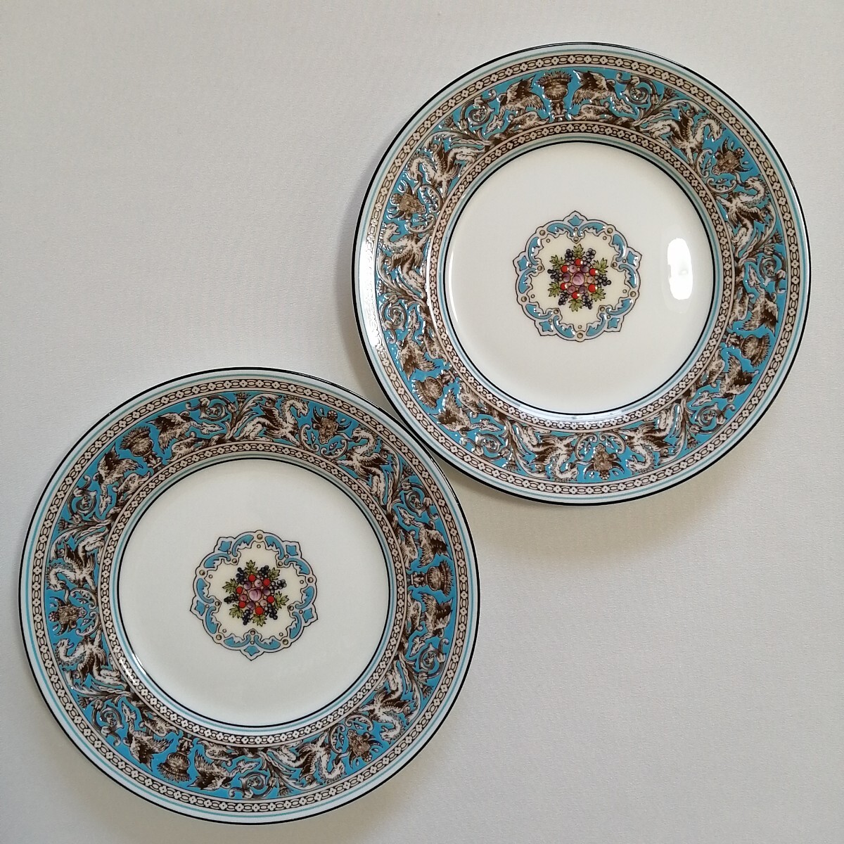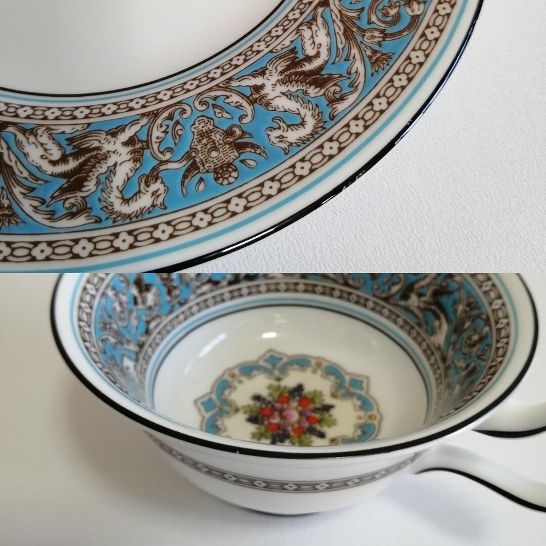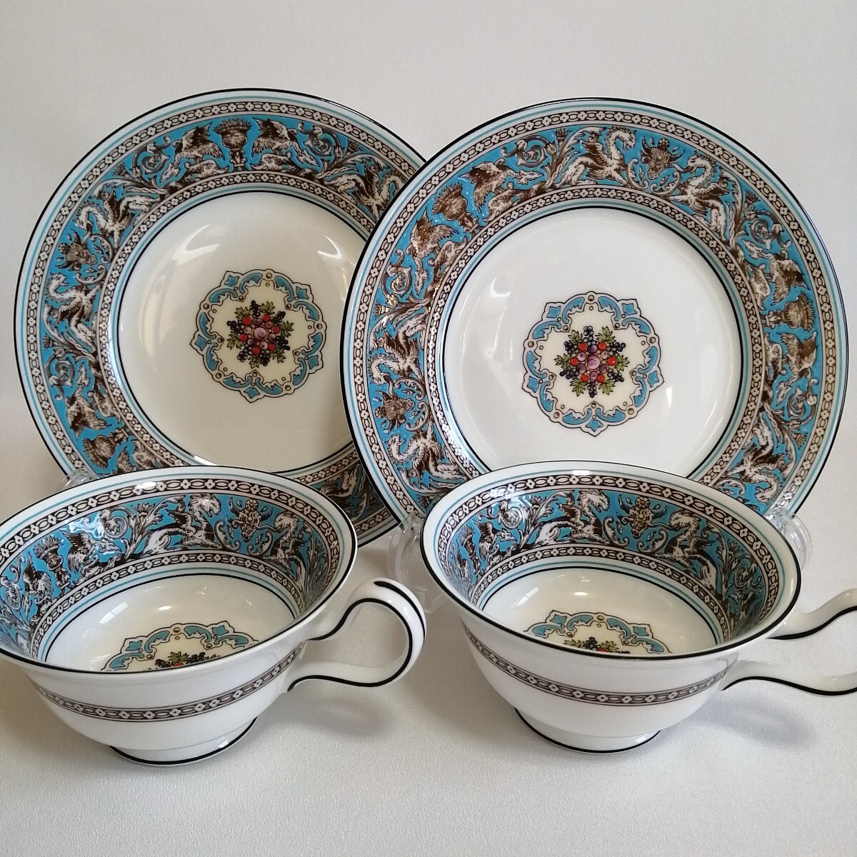WEDGWOOD ウェッジウッド 黒壺刻印/17.5cmケーキデザート皿×2枚 ティーカップのみ×2個 フロレンティーンターコイズ 英国製