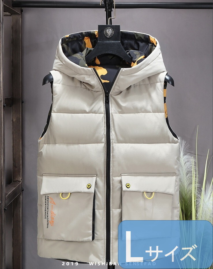 リバーシブル メンズ ダウンベスト 998 ベージュ Lサイズ 中綿ダウン 中綿ベスト キルティング アウター 防寒 秋冬 暖かい