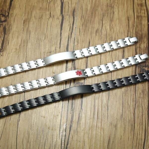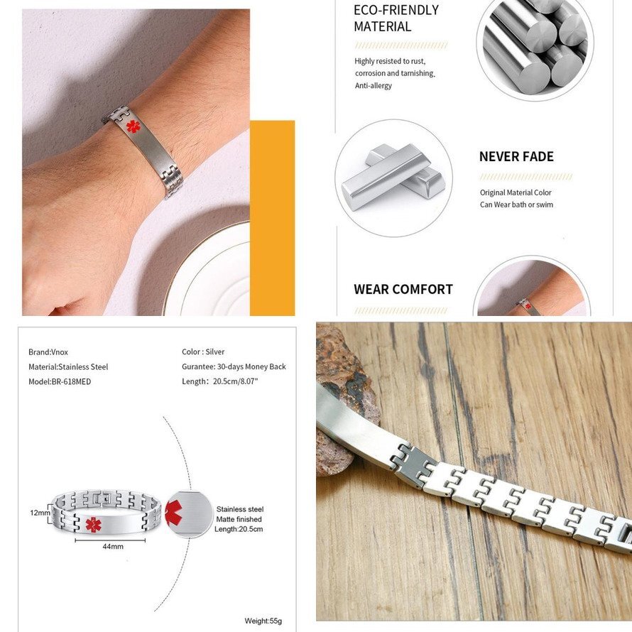 メディカル アラート ID ブレスレット メンズ 無料刻印 ステンレス バー バングル カジュアル 緊急連絡先 リマインダー IDブレスレット
