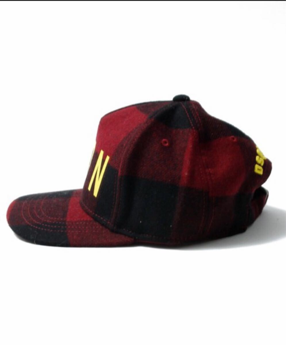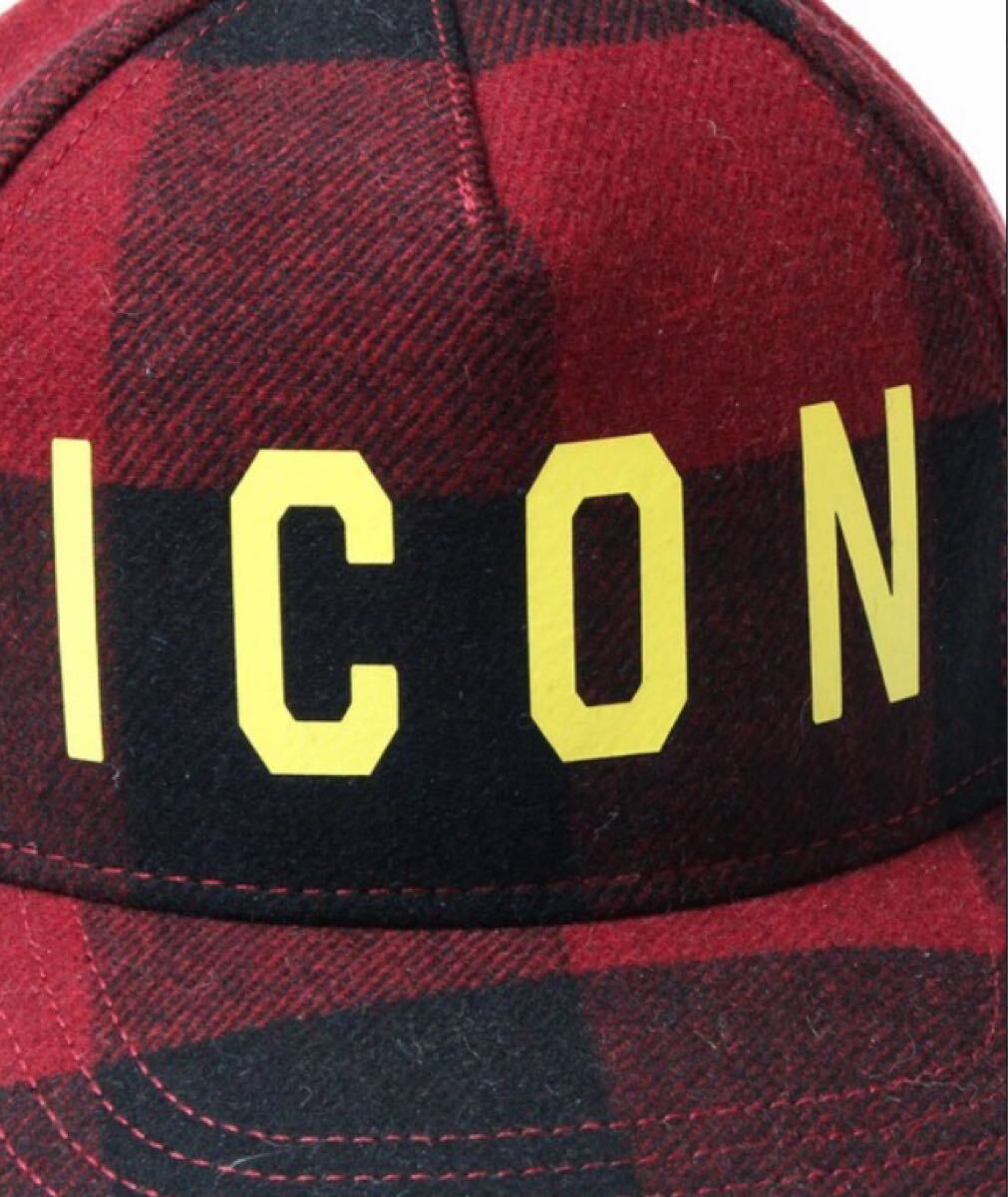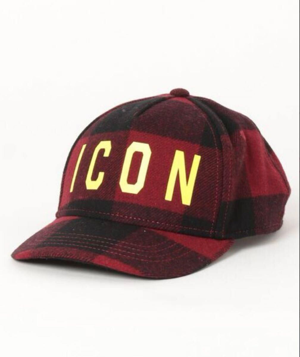 赤と黒のチェック柄にアイコンの刺繍が施されたキャップ。