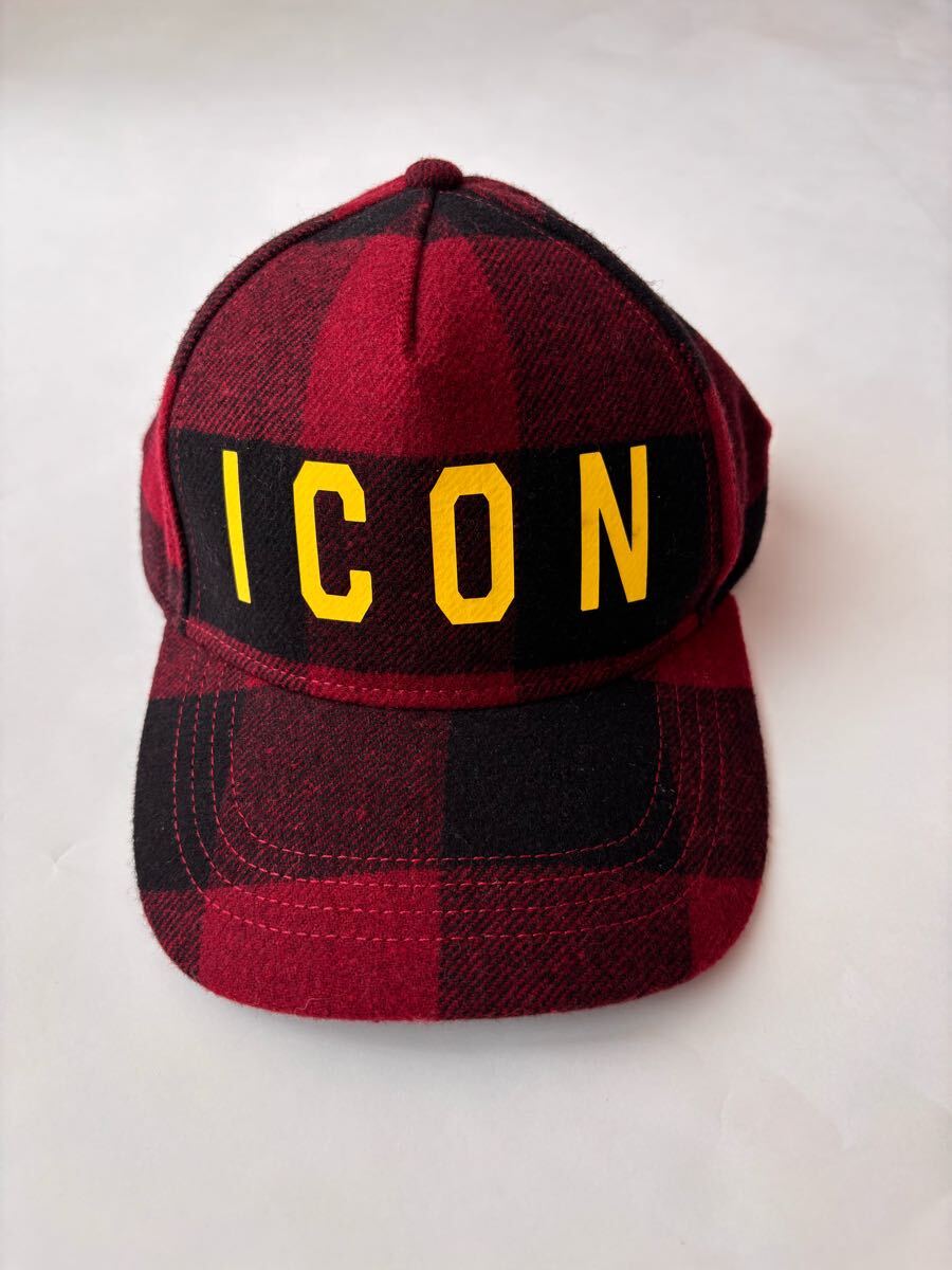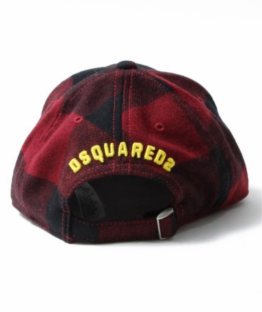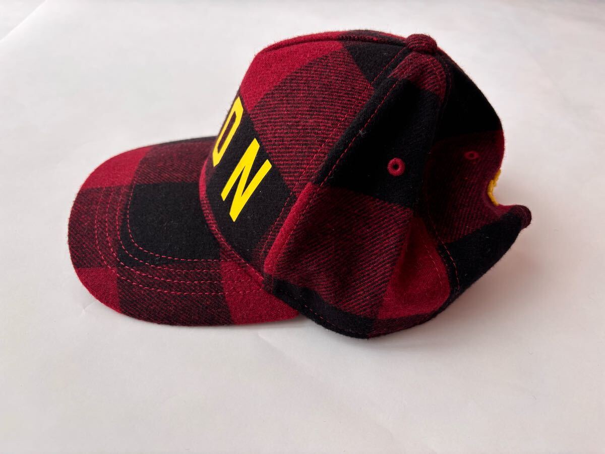 赤と黒のチェック柄にアイコンの刺繍が施されたキャップ。