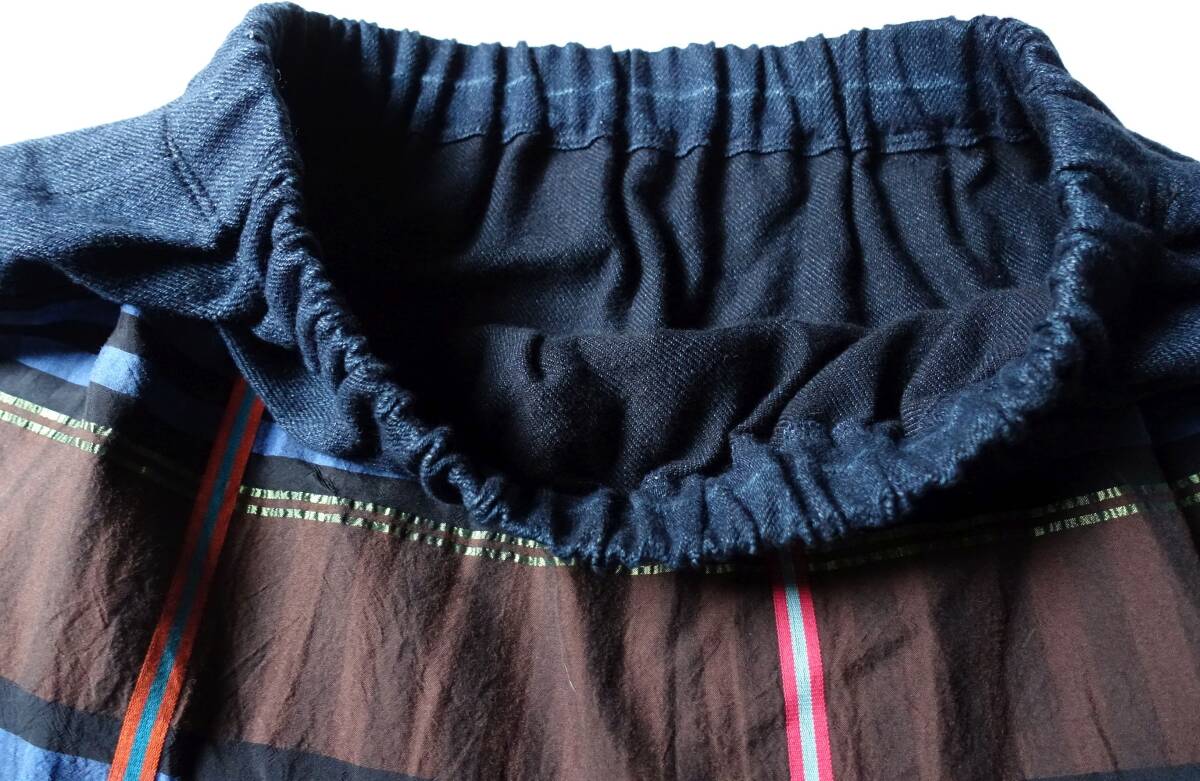 ロングスカートは、ウエスト部分がインディゴのカットソー地に切り替わっています。ウエストはゴム仕様で動きやすく快適な穿き心地。柄が引き立つゆったりとしたシルエットで体型をカバーできるのもポイント。高い縫製技術で仕立てており、どこから見てもおしゃれで、セットアップでもそれぞれ単品でも使える着回しの効く1枚。