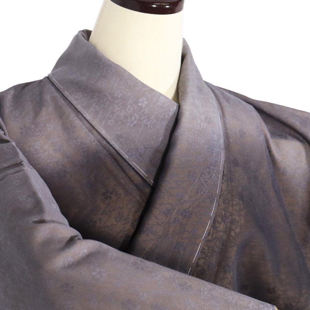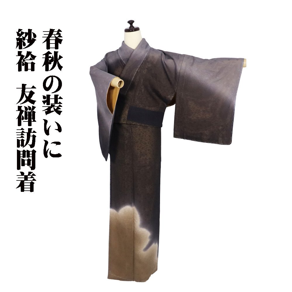 | 紗袷 友禅訪問着 丹後縮緬地 表地:紗 薄紫(二藍色)・グレー紫(濃鼠色)・ 抹茶色(芝翫茶色)暈し地桜地模様地 桜・友禅暈し 中側:黄土色(櫨染色) 163 広襟 新品 仕付け付き | |