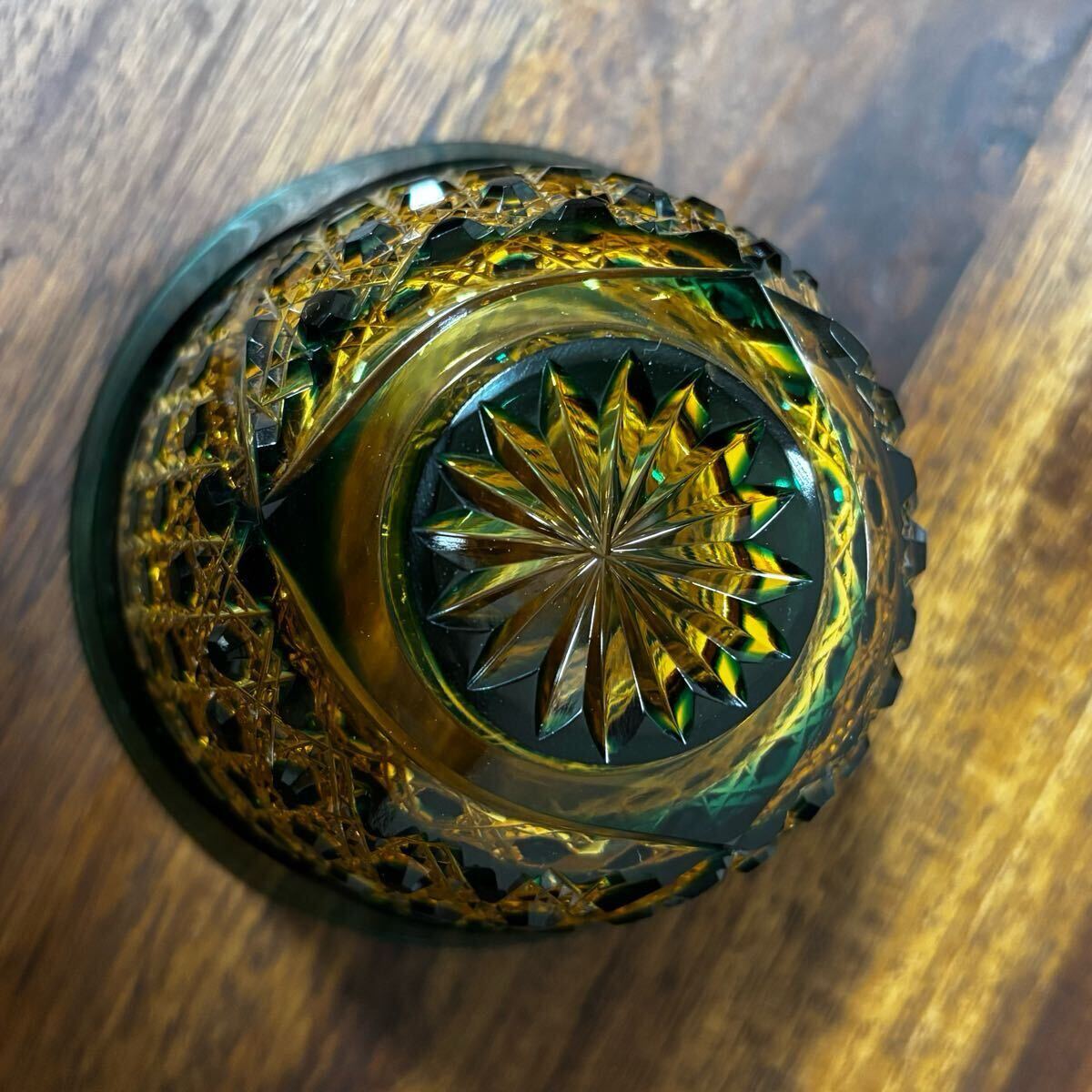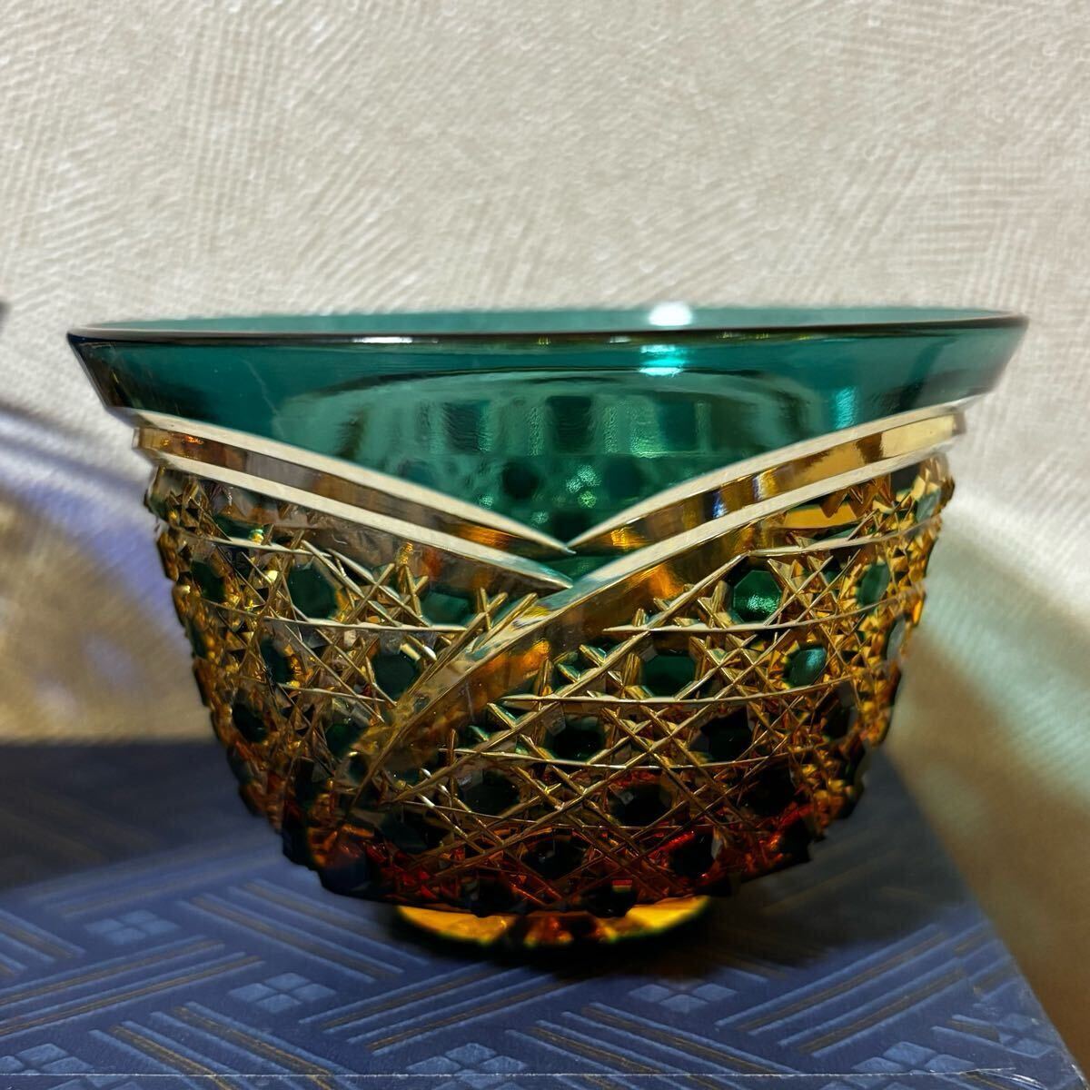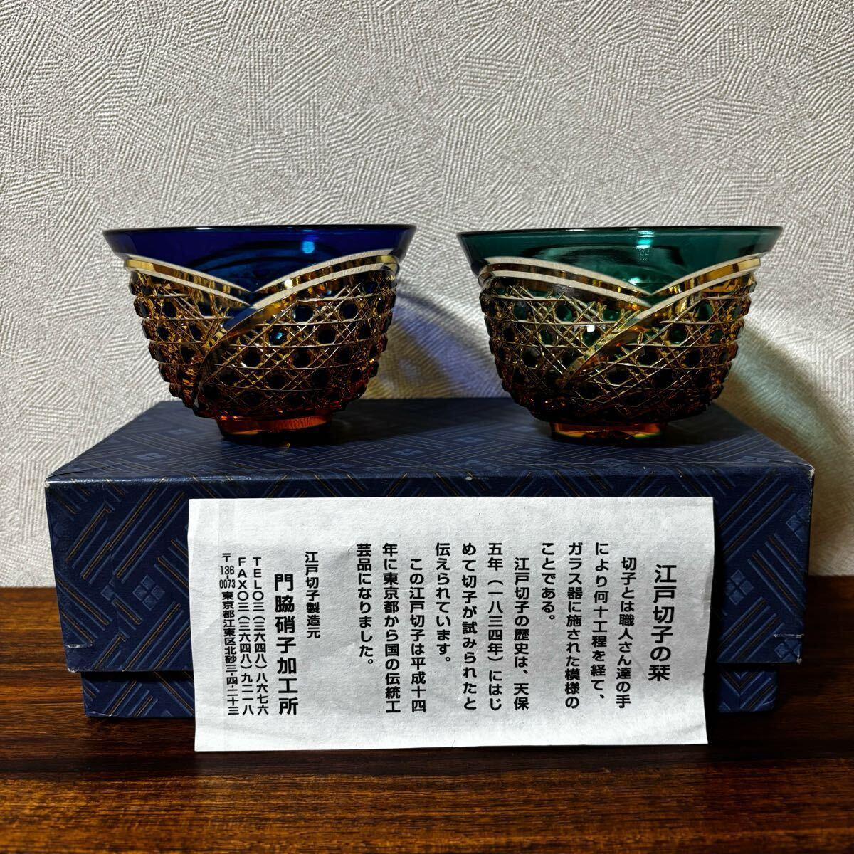 希少 未使用 門脇硝子 江戸切子 琥珀 アンバー 緑 瑠璃 ぐい呑み お猪口 2客 箱入り コレクション 送料無料