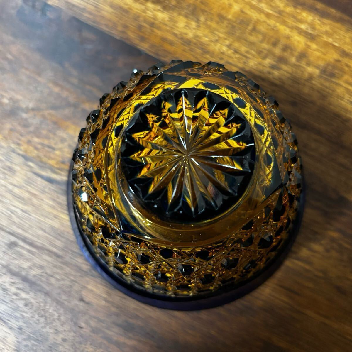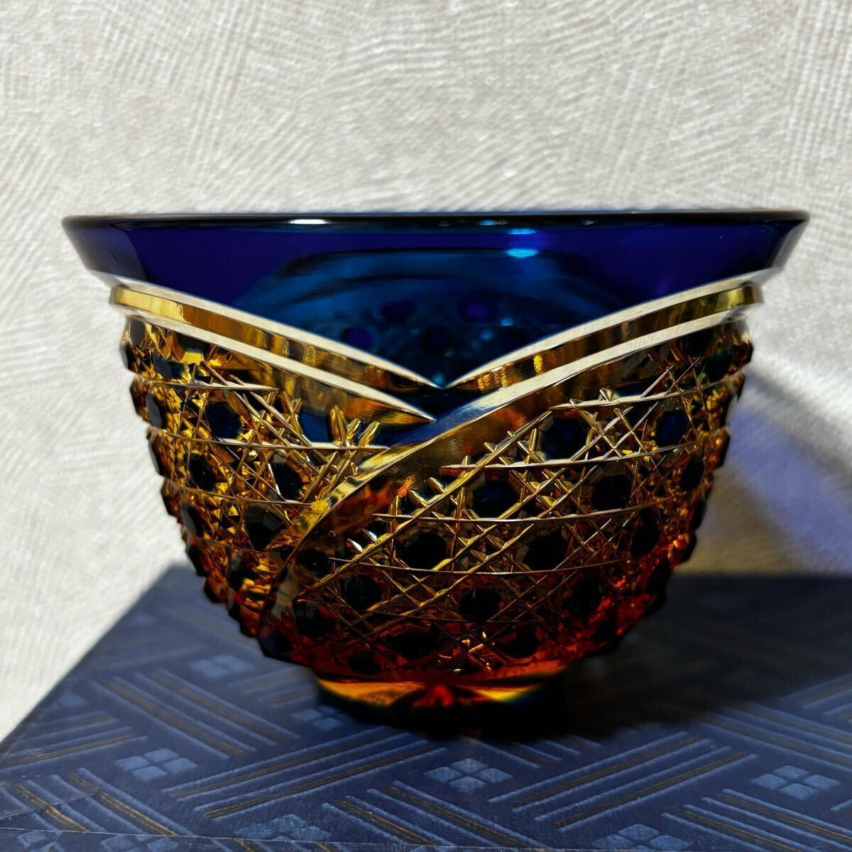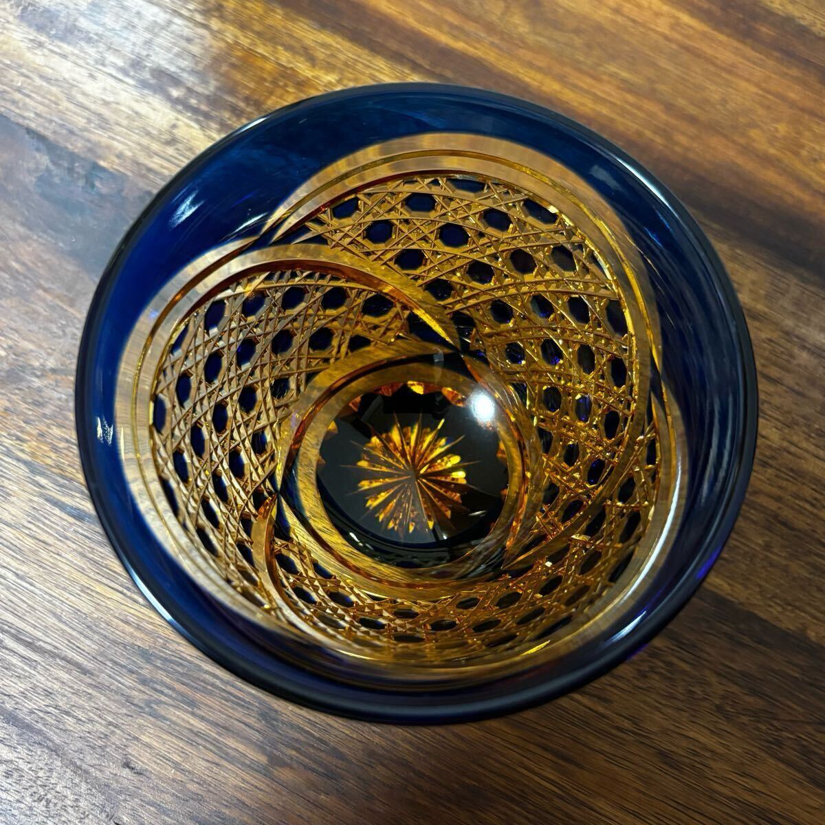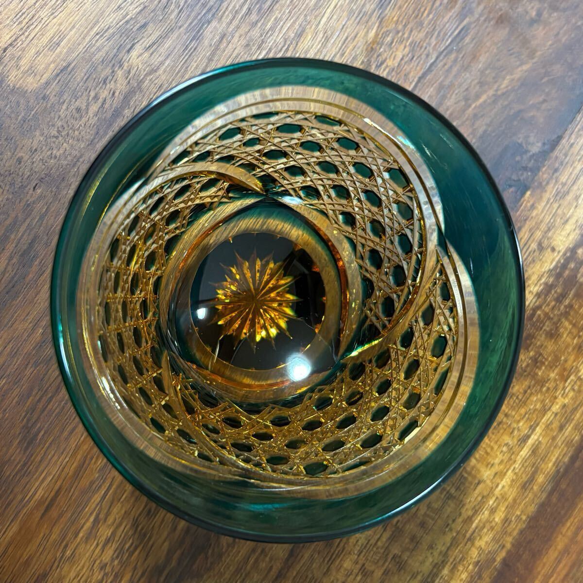 希少 未使用 門脇硝子 江戸切子 琥珀 アンバー 緑 瑠璃 ぐい呑み お猪口 2客 箱入り コレクション 送料無料
