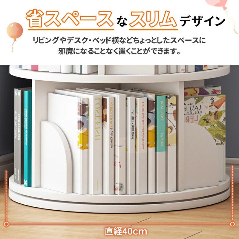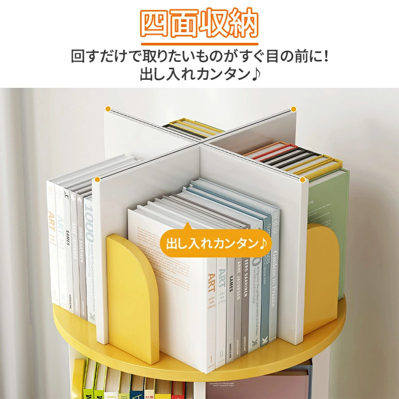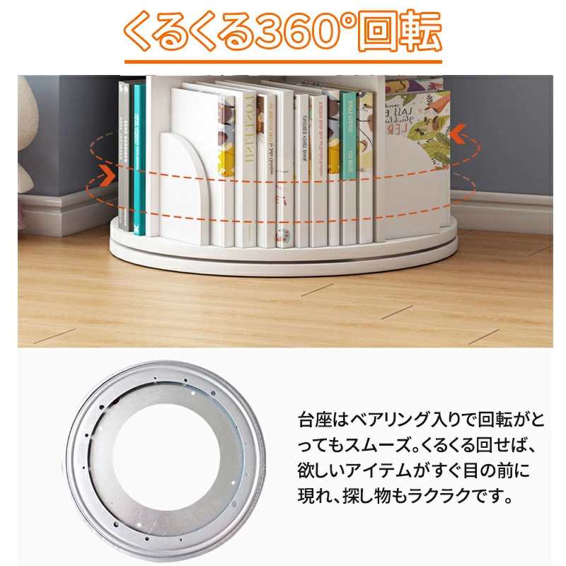 【360度回転式本棚】台座はベアリング入りで回転がとってもスムーズ。くるくる360度回せば、欲しいアイテムがすぐ目の前に現れ、探し物も楽々です。1段高さ30cm、A4サイズの収納に最適な回転式ラック。お部屋のコーナーなど狭い場所にも気軽に設置できます。
