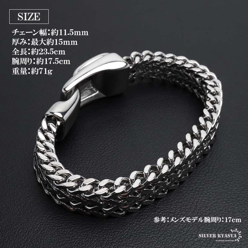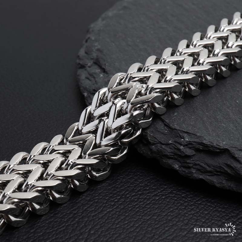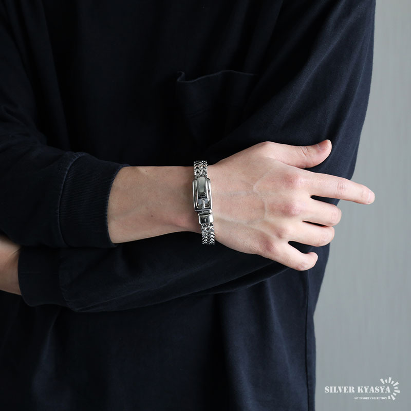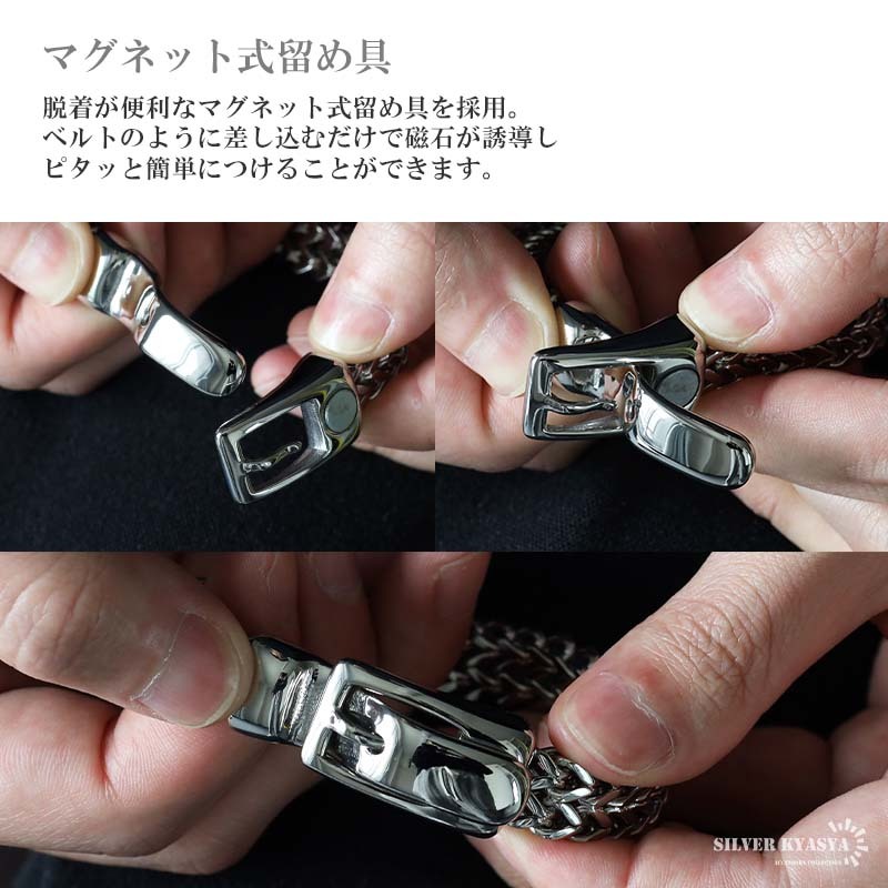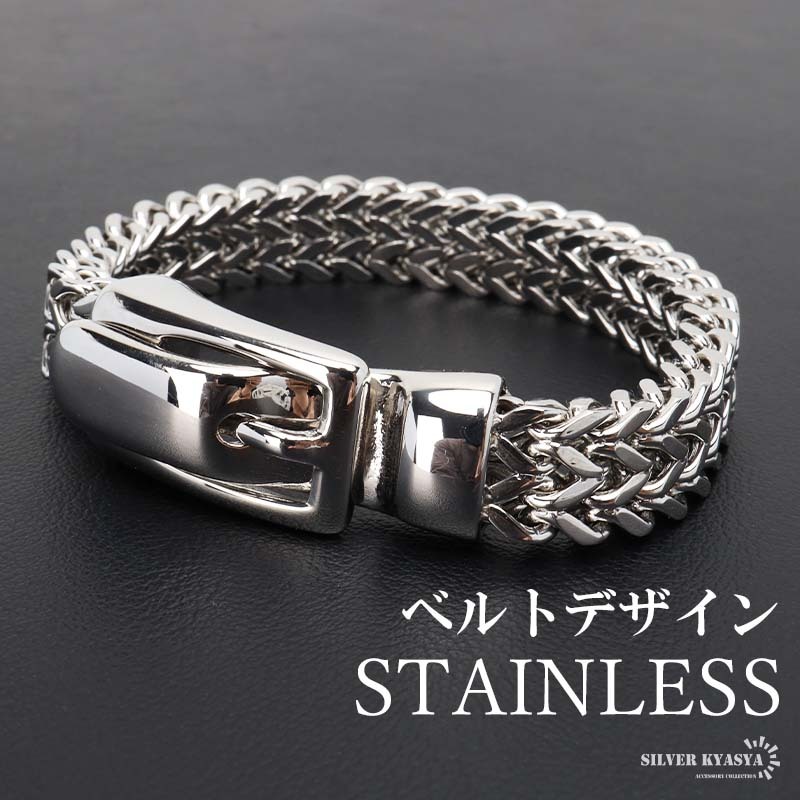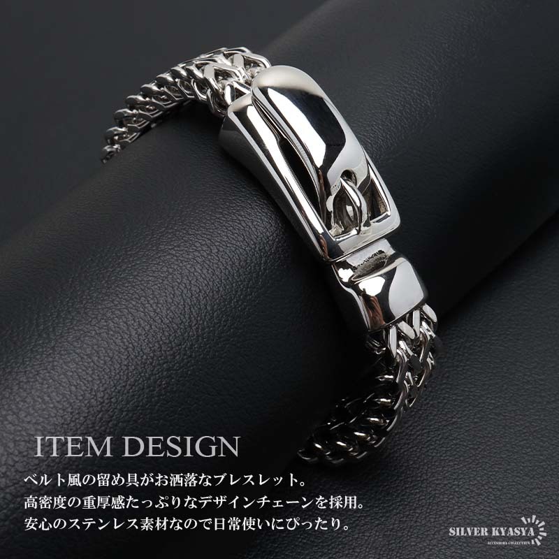 ベルト風の留め具がお洒落なブレスレット。高密度の重厚感たっぷりなデザインチェーンを採用。安心のステンレス素材なので日常使いにぴったり。