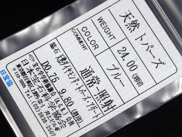 ●24.00ct 【ct数の刻印あり】 ◆脇石 天然ブルートパーズ ◆天然アゲート ●総計9.8ct 【ct数の刻印あり】 ◆天然ダイヤモンド ●総計0.75ct 【ct数の刻印あり】 ◆付属品【日本宝石科学協会】発行ソーティング】 |