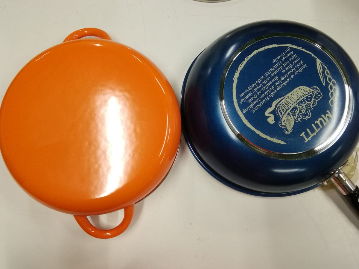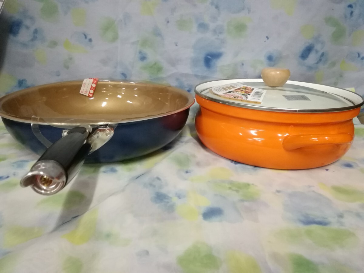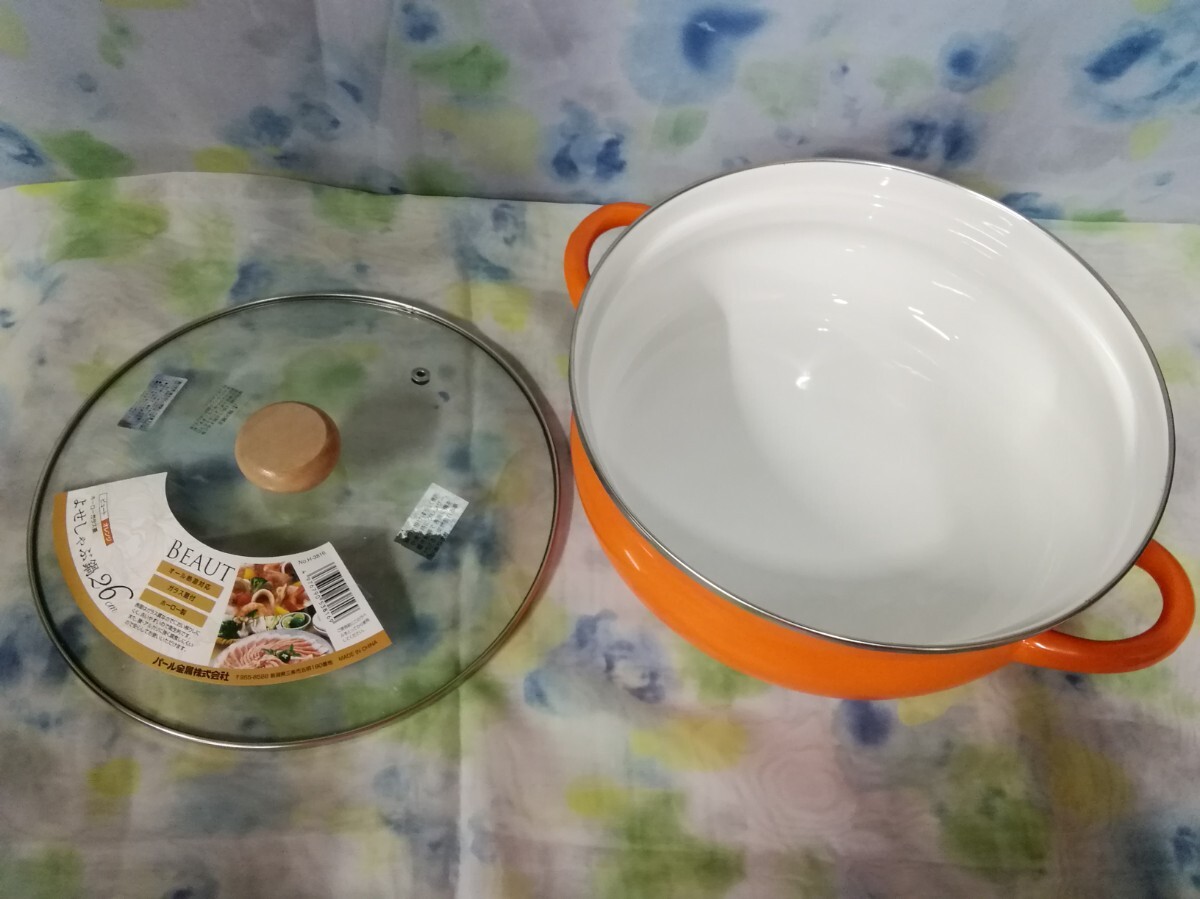 ホーローガラス蓋よせしゃぶ鍋 26cm オール熱源対応/28cmいため鍋 フッ素樹脂加工 ※変形あり 【未使用長期保管品】