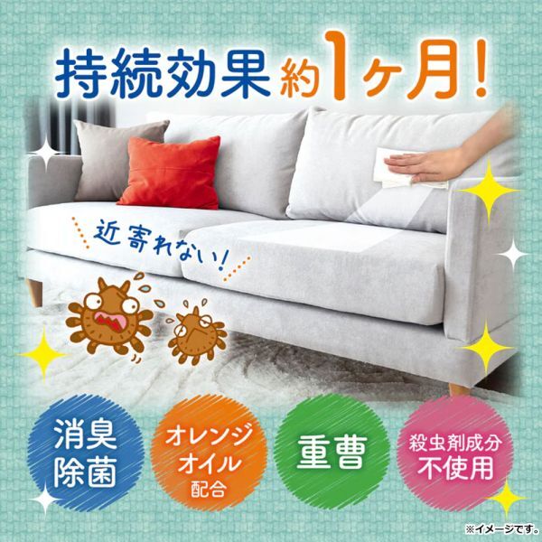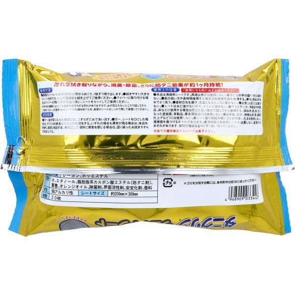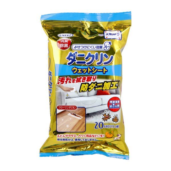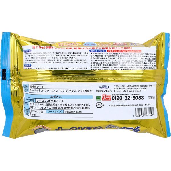 ササッと拭けて防ダニ加工まで よせつけにくい効果 汚れを拭き取りながら消臭除菌 さらに防ダニ効果が約1ヶ月持続 殺虫剤成分は使用しておりません オレンジオイル配合 大判厚手 フローリング/カーペット/ソファー/ふとん/タタミ/ペット用品などにも ※シートは水に溶けないのでトイレに流さないでください 【商品詳細】 シートサイズ:約200mmX300mm 個装サイズ:135mmX225mmX45mm 個装重量:約194g 内容量:20枚入 用途:カーペット、ソファー、フローリング、タタミ、マット類など 成分:水、エタノール、脂肪族系カルボン酸エステル(防ダニ剤)、重曹、オレンジオイル、除菌剤、界面活性剤、安定化剤、香料 液性:弱アルカリ性 シート材質:レーヨン、ポリエステル 製造国:日本 発売元:株式会社UYEKI JANコード:4968909033443 |