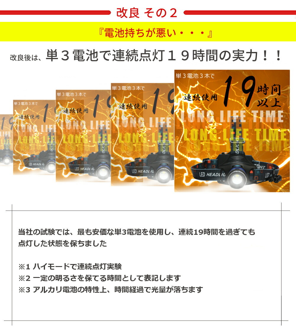 最も安価な単3電池を使用し、連続19時間を過ぎても点灯した状態を保ちました。