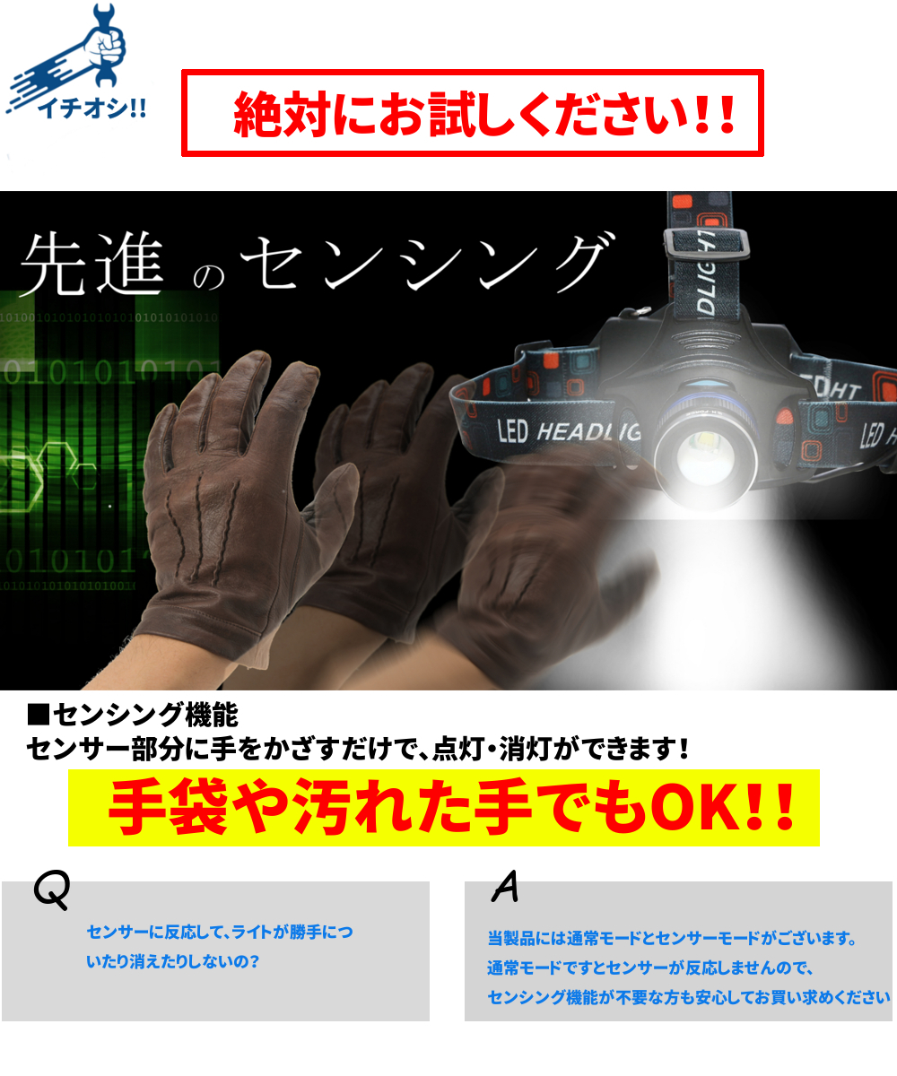 *愛用者続出★ LED ヘッドライト センサー付き 防水 19h点灯 電池式