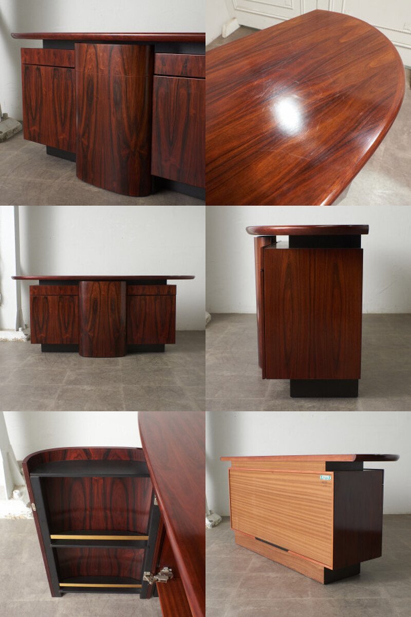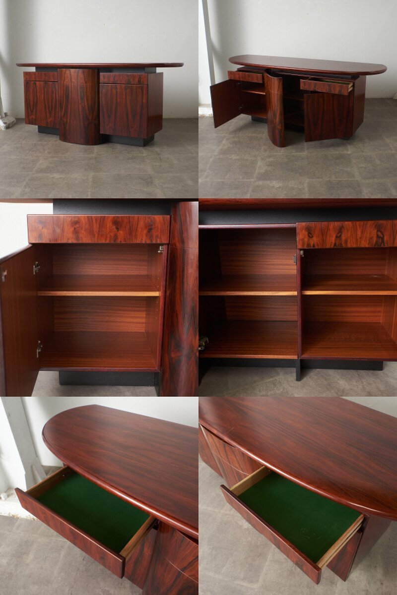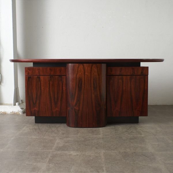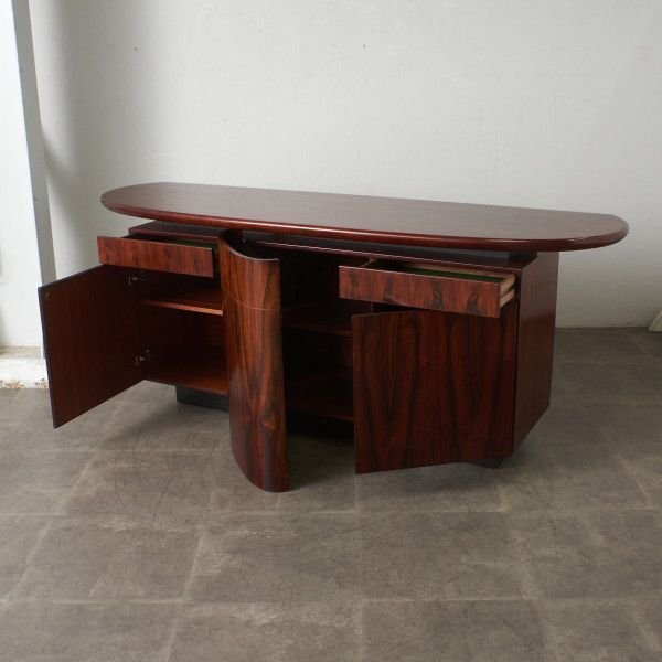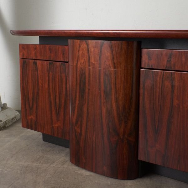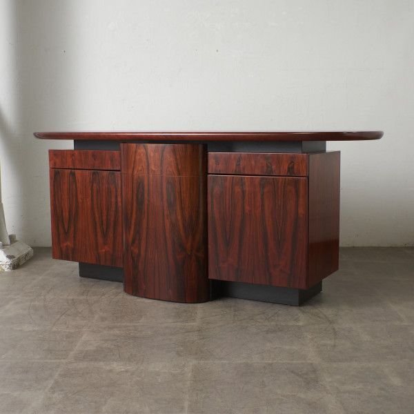高級材ローズウッドを使用したサイドボード。重厚感のある木目と曲線を取り入れたモダンなフォルムが融合し、北欧らしい洗練されたバランスを演出しています。収納力も高く、高級感と機能性を兼ね備えた一品です。