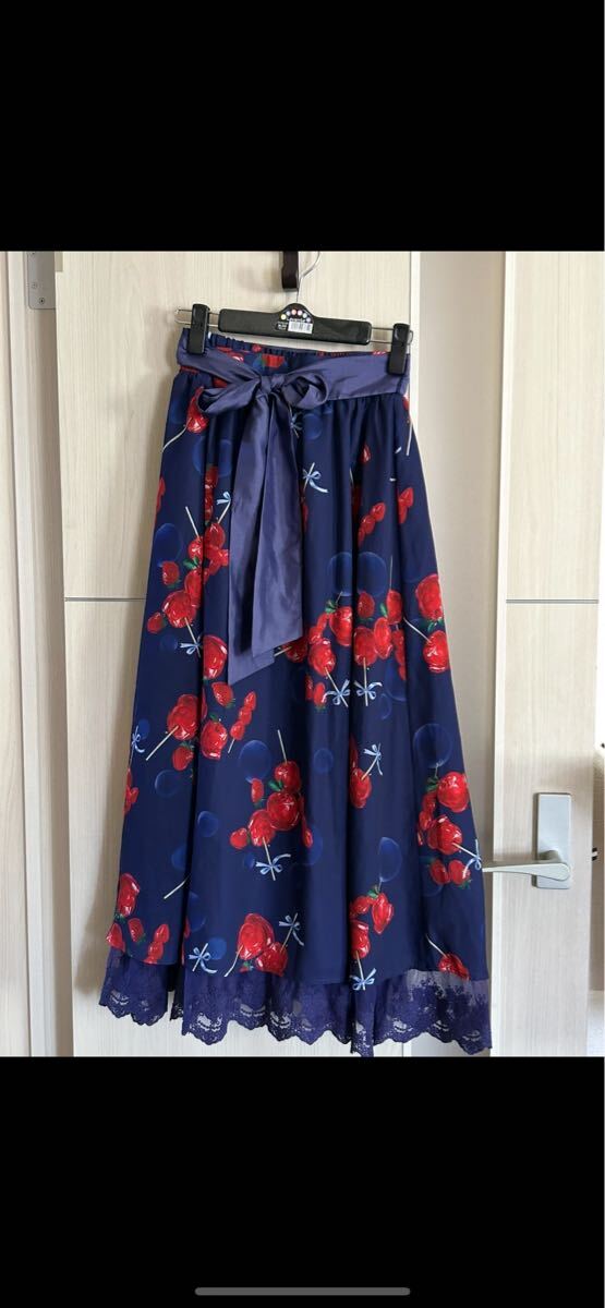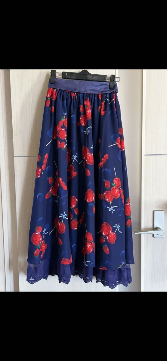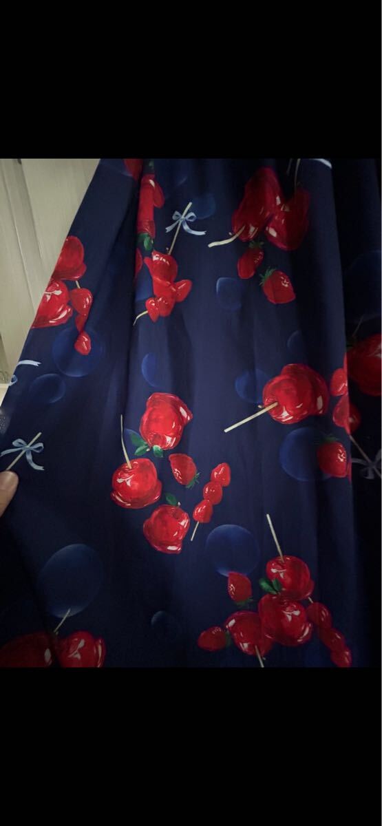 さくらんぼ、リボン、いちご、りんご飴、いちご飴などのイラスト柄です、の可愛いスカートです。