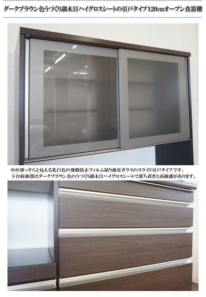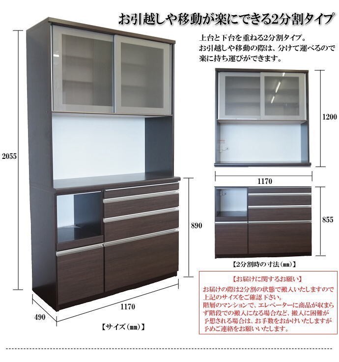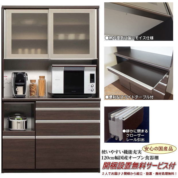 | 【商品名】 | スライドテーブル付120cm幅国産レンジ食器棚 (ダークブラウン) 開梱設置無料 | |