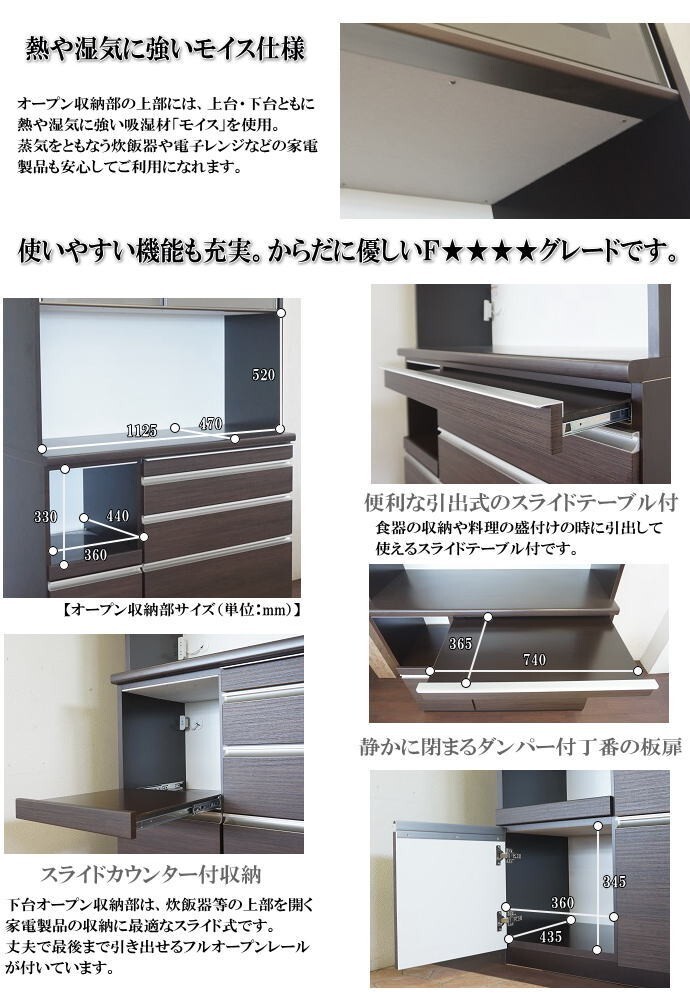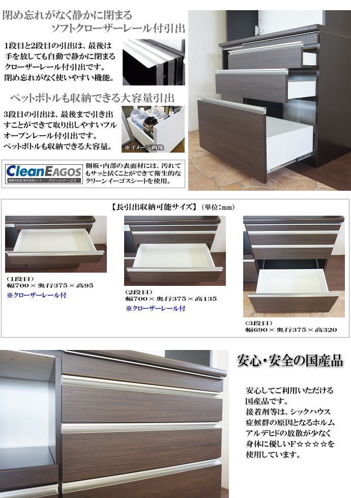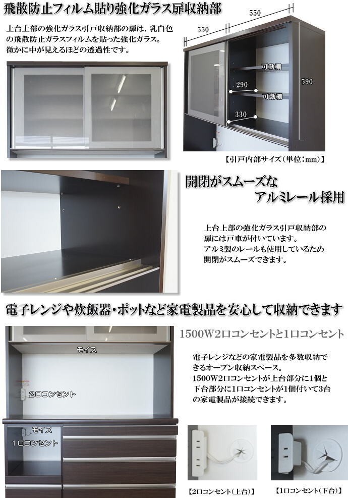 | 【商品説明】 | ※安心・安全の国産品です。 【材質について】 ●繊維板・パーティクルボードおよび接着剤はF★★★★グレードで、塗料はホルムアルデヒドを含みません。 ●引出・扉の表面材にキズ・汚れに強い「ハイグロスシート」を使用しています。木目が浮き出た「うづくり調」のハイグロスシートです。 ●側面等の本体部分には汚れてもサット拭ける「クリーンイーゴスシート」を使用しています。 ●スライド引戸には乳白色の「飛散防止フィルム貼り強化ガラス」を使用し、中が見え難くなっています。 ●上段・下段どちらのオープンスペースも上部には、熱や湿気に強い素材「モイス」を使用しています。 ●上段オープンスペースのカウンター部分には熱や汚れに強い「メラミン化粧板」を使用しています。カウンターまでの高さは、使いやすい89cmです。 【機能について】 ●上台上部の強化ガラス引戸収納部の扉には戸車が付いています。アルミ製のレールも使用しているため開閉がスムーズできます。 ●オープン収納部には、上台部分は2口コンセントが左側に1箇所、下台部分に1口コンセントと充実した数のコンセントが付いています。 ●1段目と2段目の引出には「ソフトクローザー」が付いて静かにゆっくり閉まります。 ●3段目の引出しにはフルオープンレールがついて最後まで引き出せます。また、ペットボトルも立てて入れることができます。 ●引出し式のスライドテーブルがついて、食器棚の収納や料理の盛り付けの時などに便利です。 ●下台オープン収納部は、炊飯器等の上部を開く家電製品の収納に最適なスライド式です。丈夫で最後まで引き出せるフルオープンレールが付いています。 ●下台オープンスペース下の扉には、ゆっくり閉まるダンパー付丁番が付いています。 | |