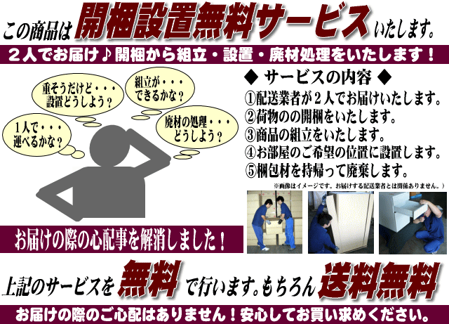 | 【送料】 | 送料・開梱設置無料(一部地域を除きます) ※東北・北海道・沖縄・離島地域は、別途料金が必要となりますので予め、 お問い合わせ下さい。 ※この商品は配送業者が2人でお届けし、開梱・組立・設置・廃材処理をいたします。 ※階段での3階以上の配達、吊上げによる搬入等は別料金となりますのでご注意ください。 | |