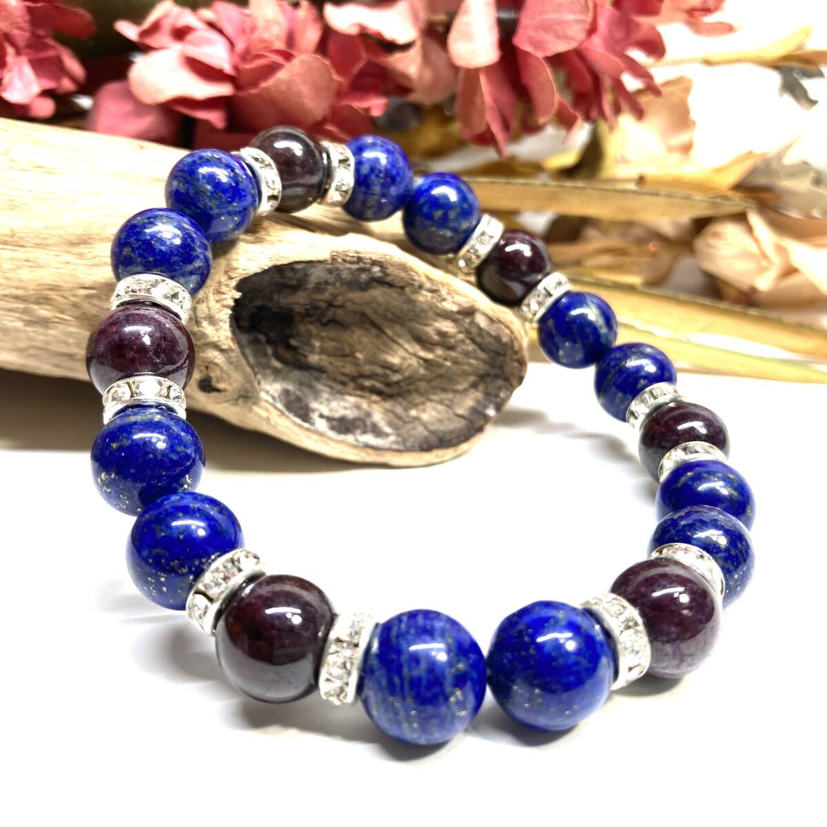 こちらは、ラピスラズリとガーネットを組み合わせたパワーストーンブレスレットです。間にはロンデルを挟み高級感あるデザインに仕上げております。石大きさは腕にも馴染みやすいように10mm玉で内径約18cm(伸可能)です。(サイズ変更の場合は取引ナビにてご連絡をお願いします。) 数に限りがございますので気になる方はお早めにどうぞ。