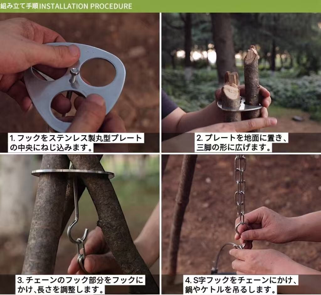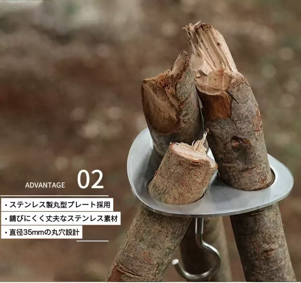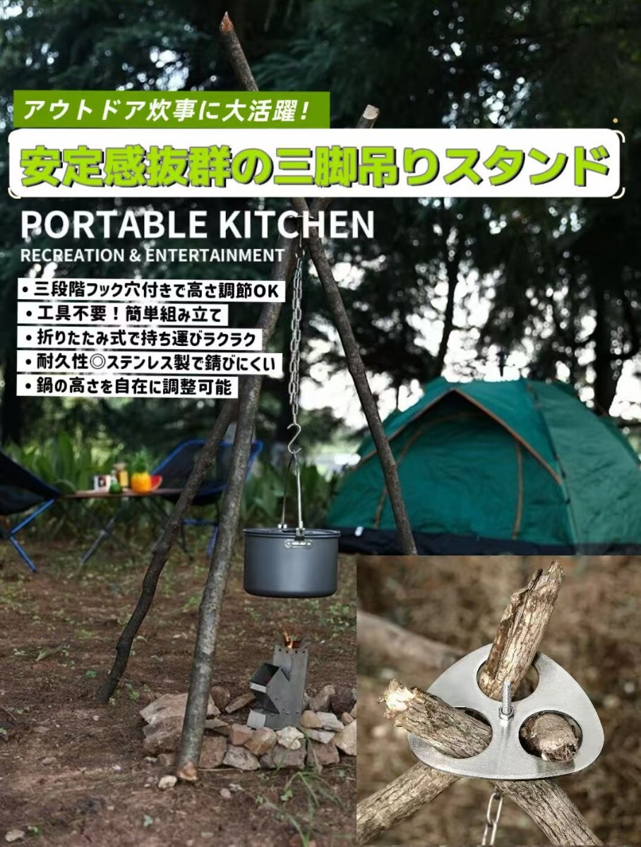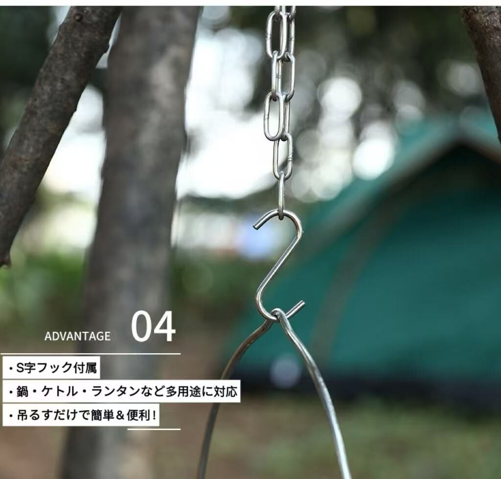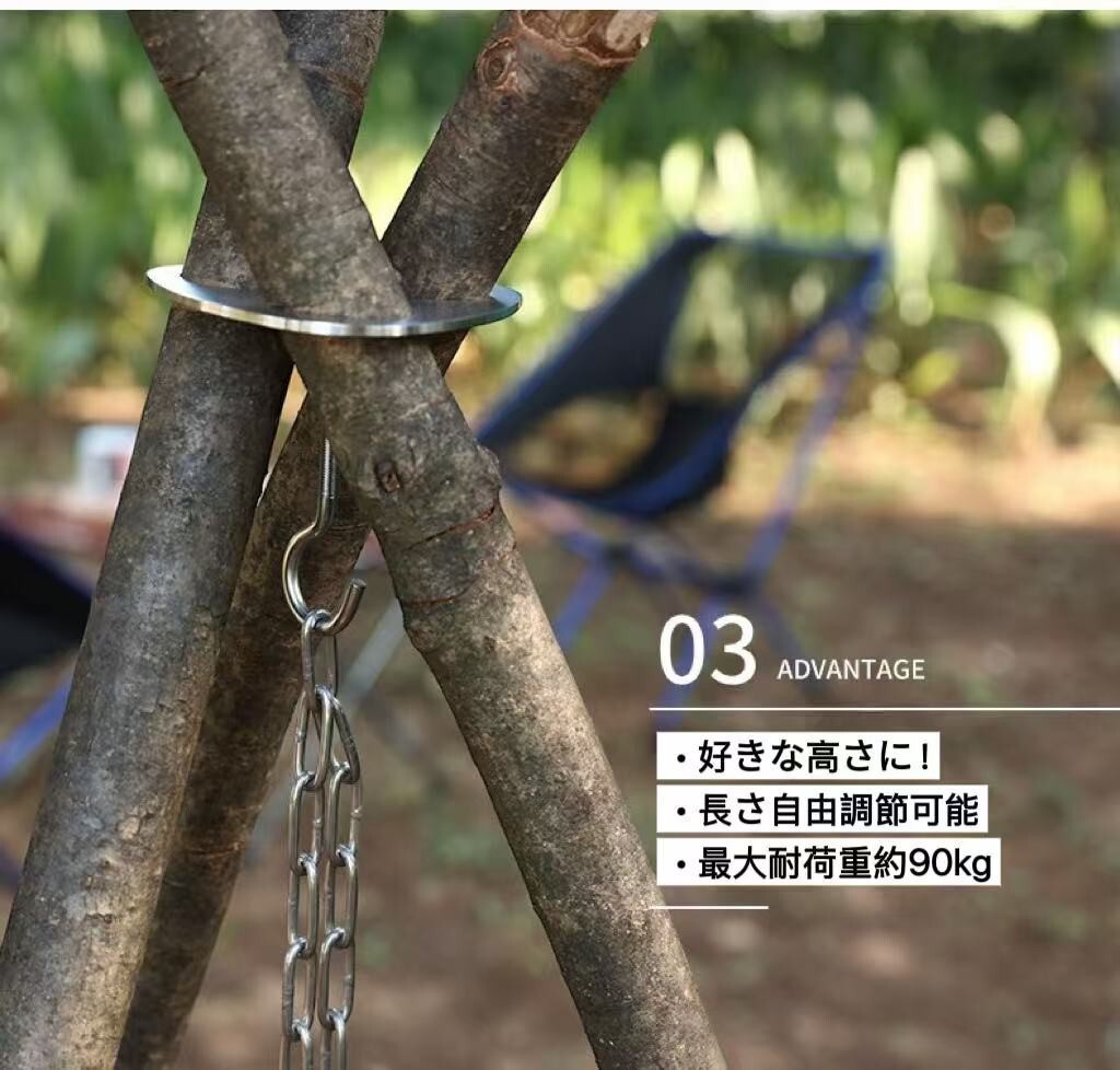■ 三脚構造で抜群の安定性:三角形の構造により、吊り鍋や調理器具をしっかりと支え、安定した調理が可能です