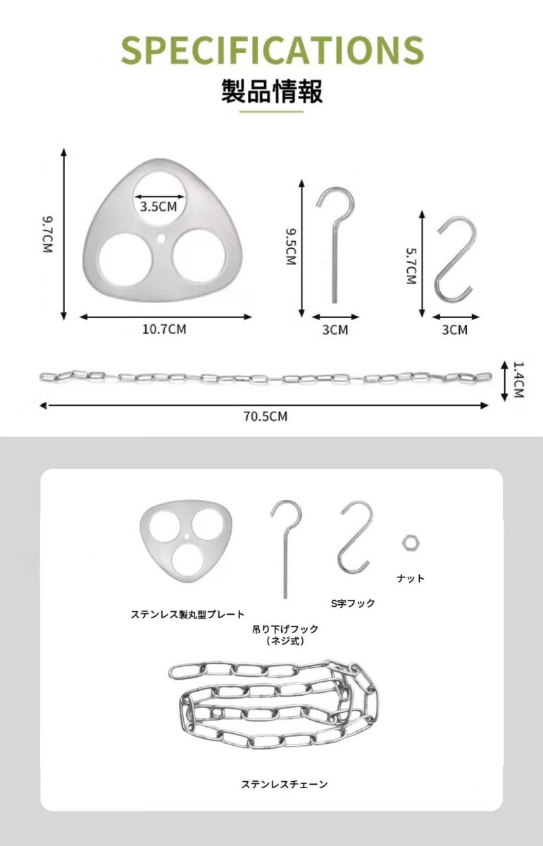 ステンレス製丸型プレート、吊り下げフック(ネジ式)、S字フック、ナット、ステンレスチェーン