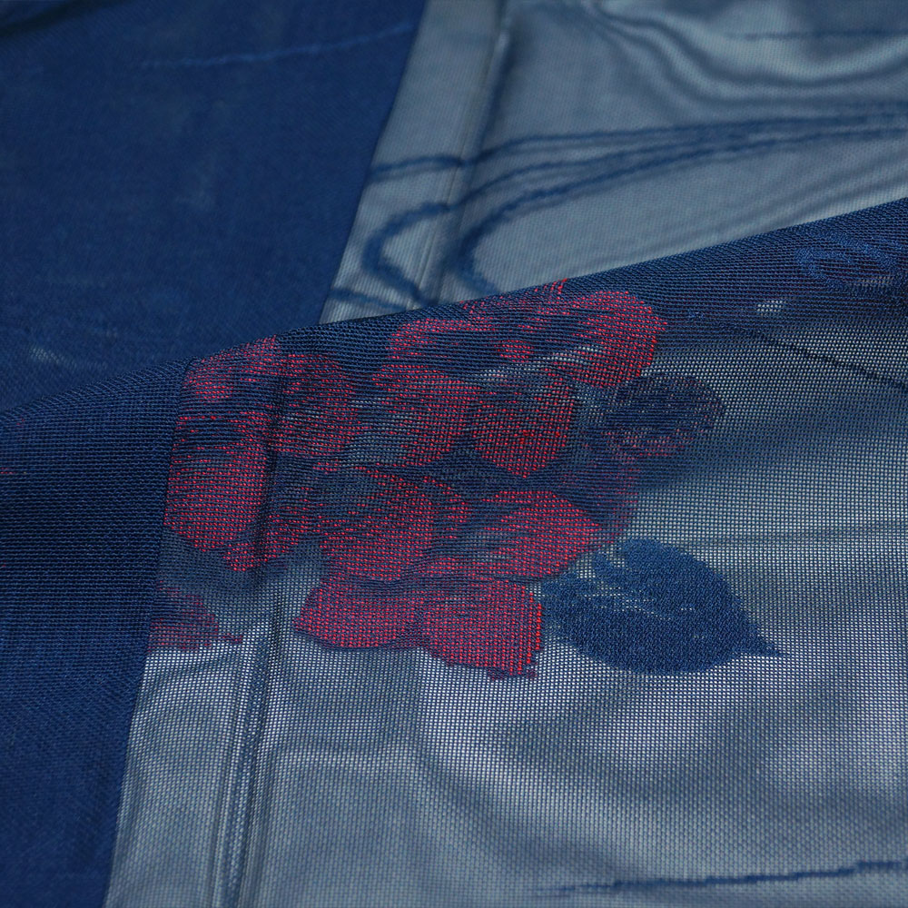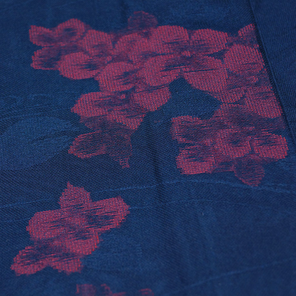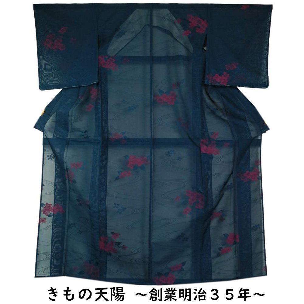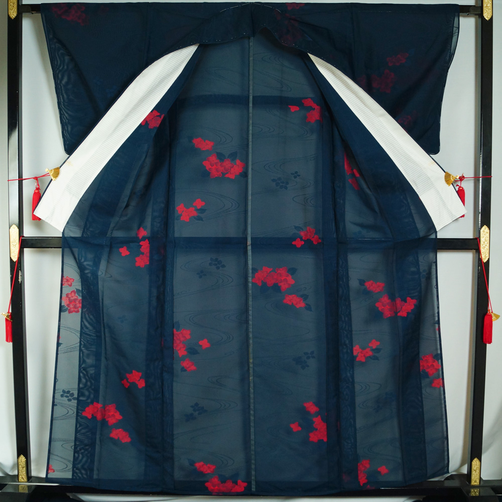 | 商品 説明 | 青藍色系の紗地に流水にハナミズキ模様が地織された夏物の小紋です。 |