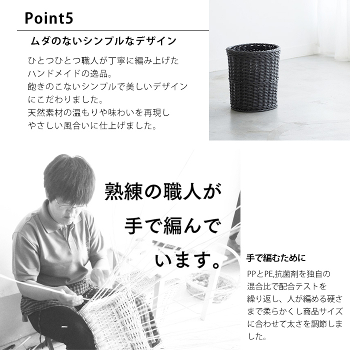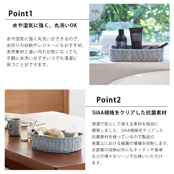 天然素材と違い、水や湿気に強く丸洗いができるので、水回りの収納やレジャーにもおすすめです。
