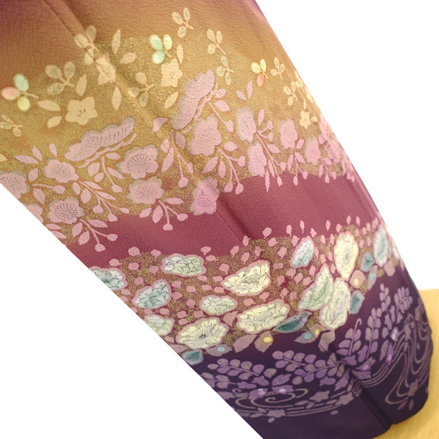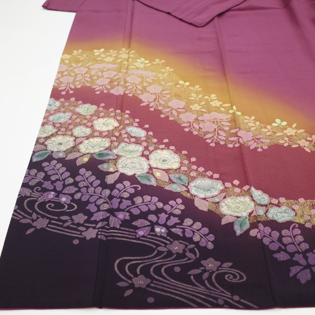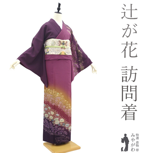 訪問着 着物 リサイクル 正絹 フォーマル 金彩加工 手染め 紫 辻が花 桜 松 中古 仕立て上がり 身丈165 裄丈69 Lサイズ みやがわ sb15592