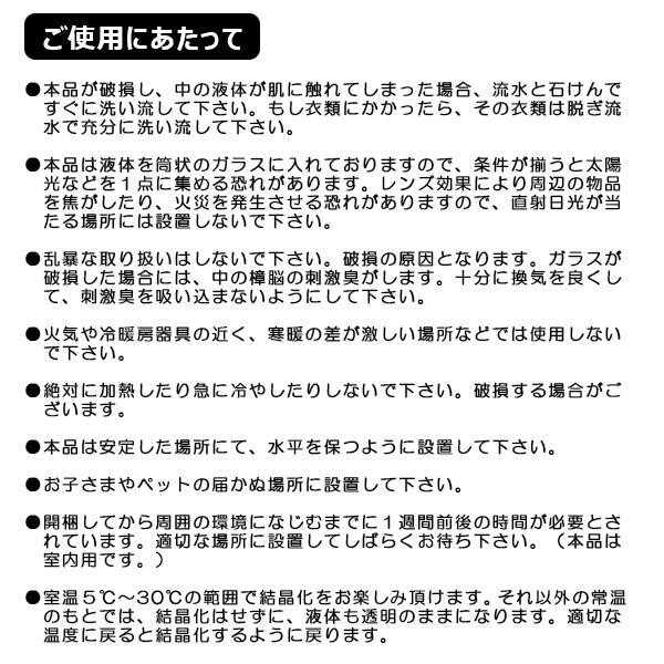 ストームグラスは19世紀初頭にヨーロッパにて航海時に気象情報を予測するのに使われていました。複数の化学薬品をアルコールに溶かしてガラス容器に詰めたもので、天候によって結晶の様子が変化すると言われています。正確な気象情報を予測するためにはお使いいただけませんが、周りの気象環境の変化によって液体と結晶がユニークに変化しますので観賞用のオーナメントとしてお楽しみ下さい。 |