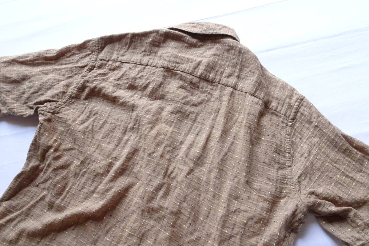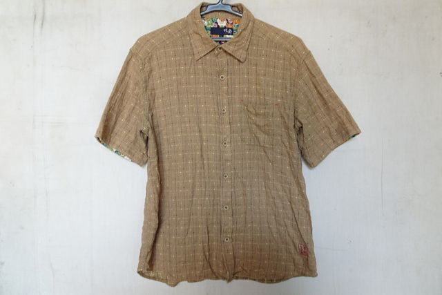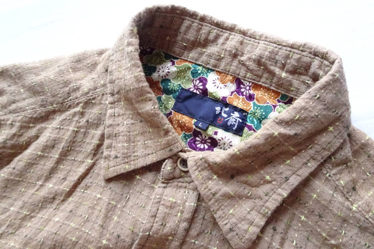 北斎/半袖シャツ/格子織り柄生地/和風花柄生地切り替え/左胸ポケット/渋い/茶/ブラウン/ベージュ/Lサイズ(6/5R7)