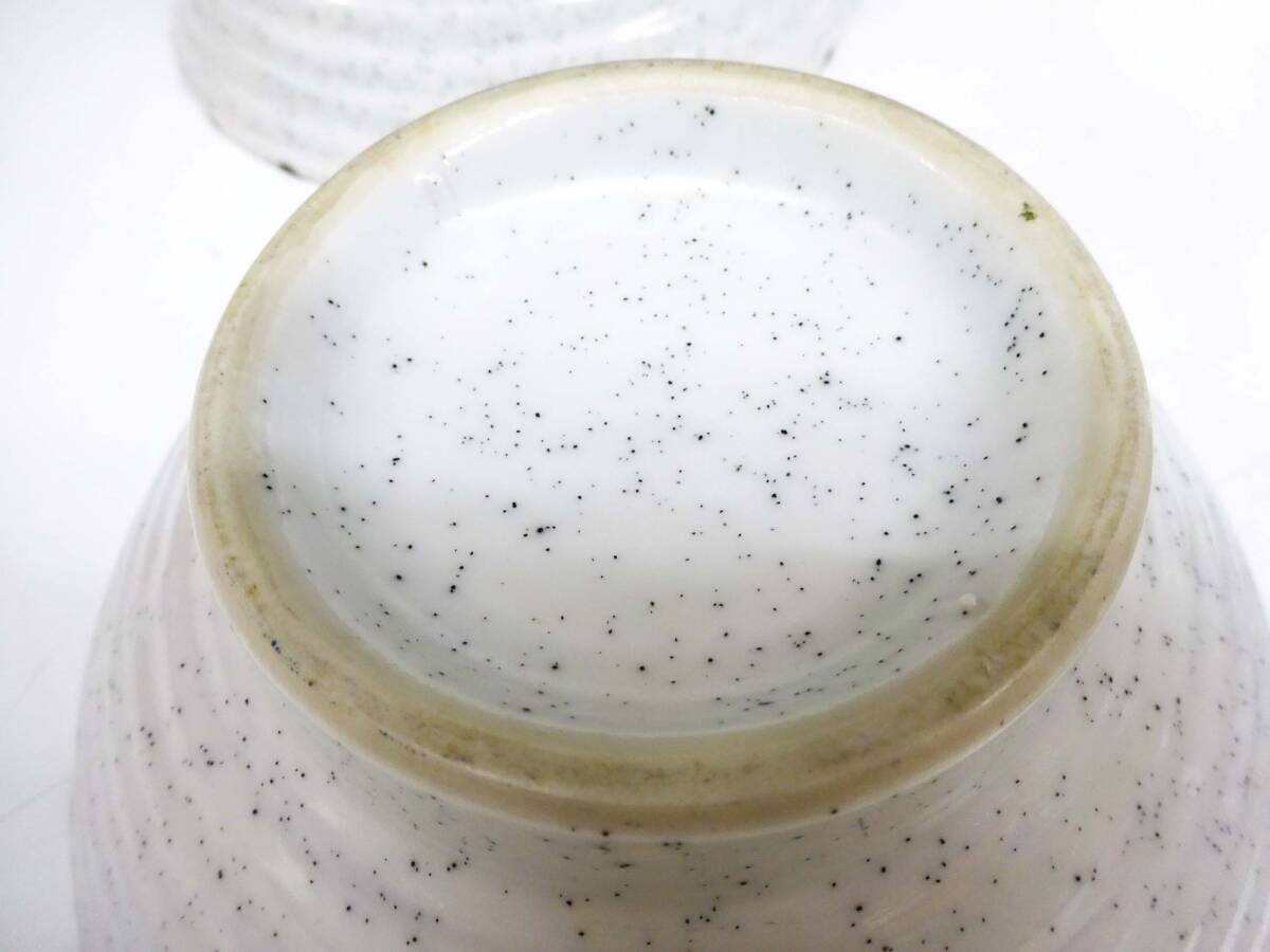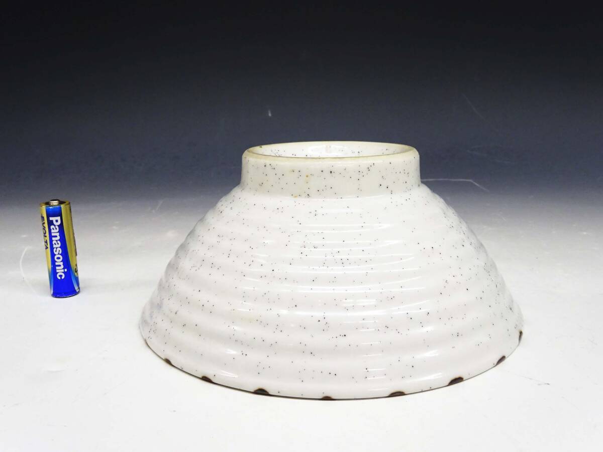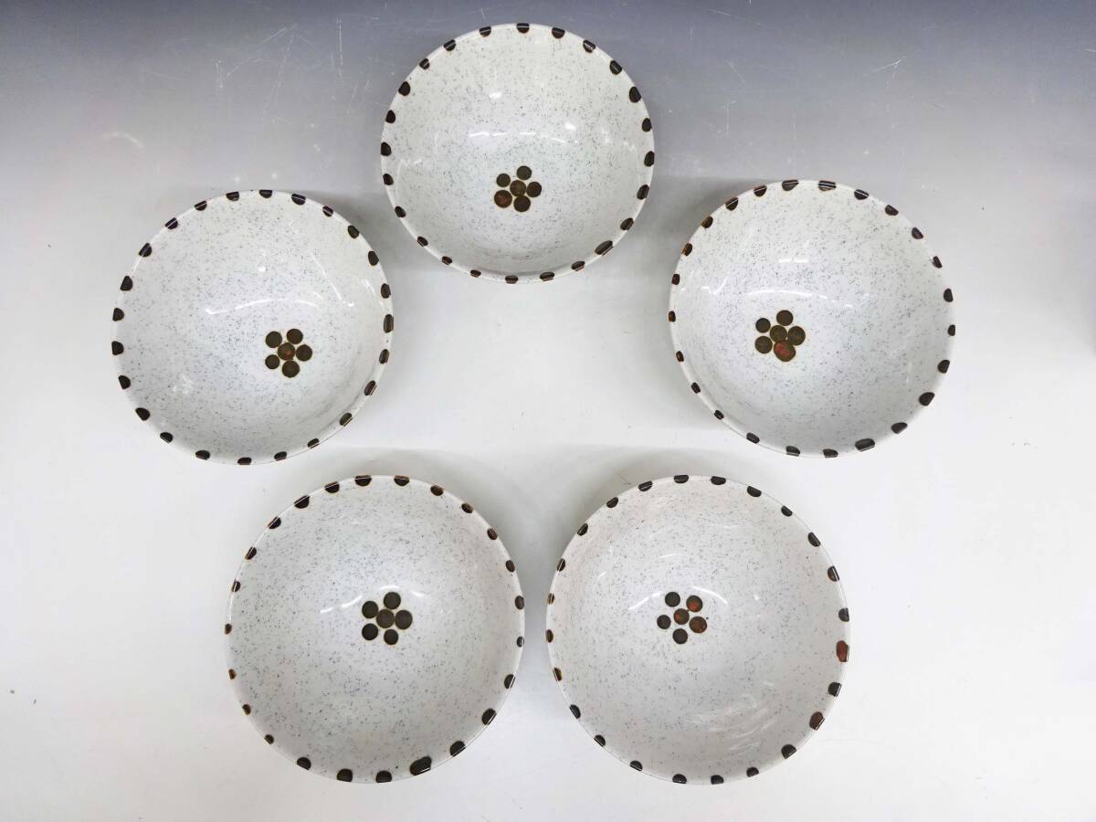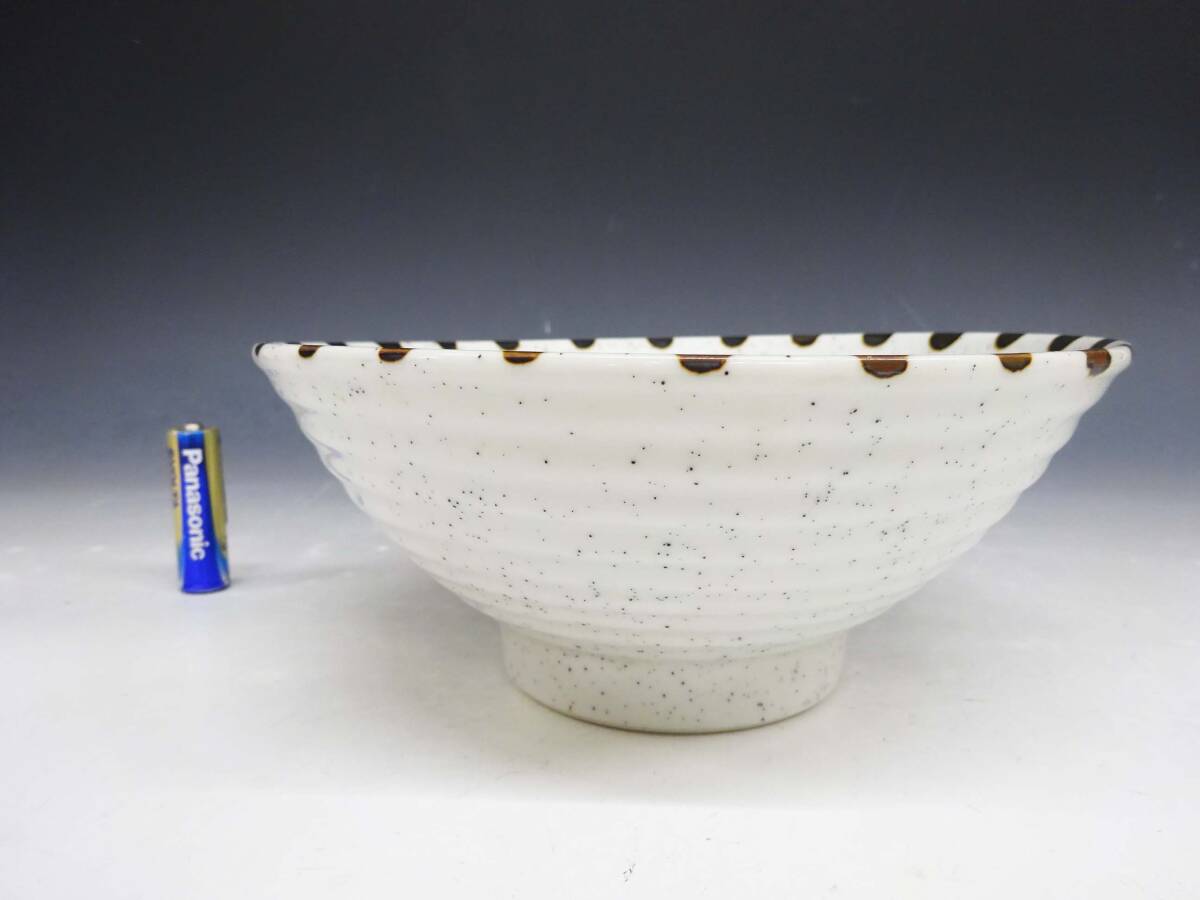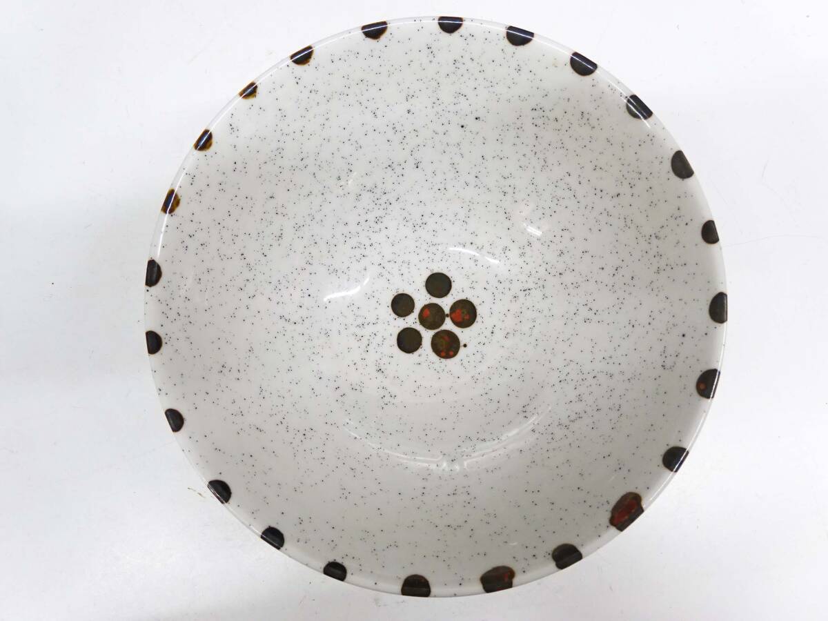 陶器製ですが、石器のような黒の斑点と茶色の花模様のどんぶりです。
