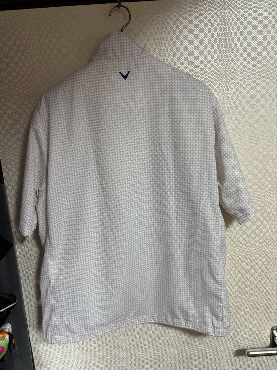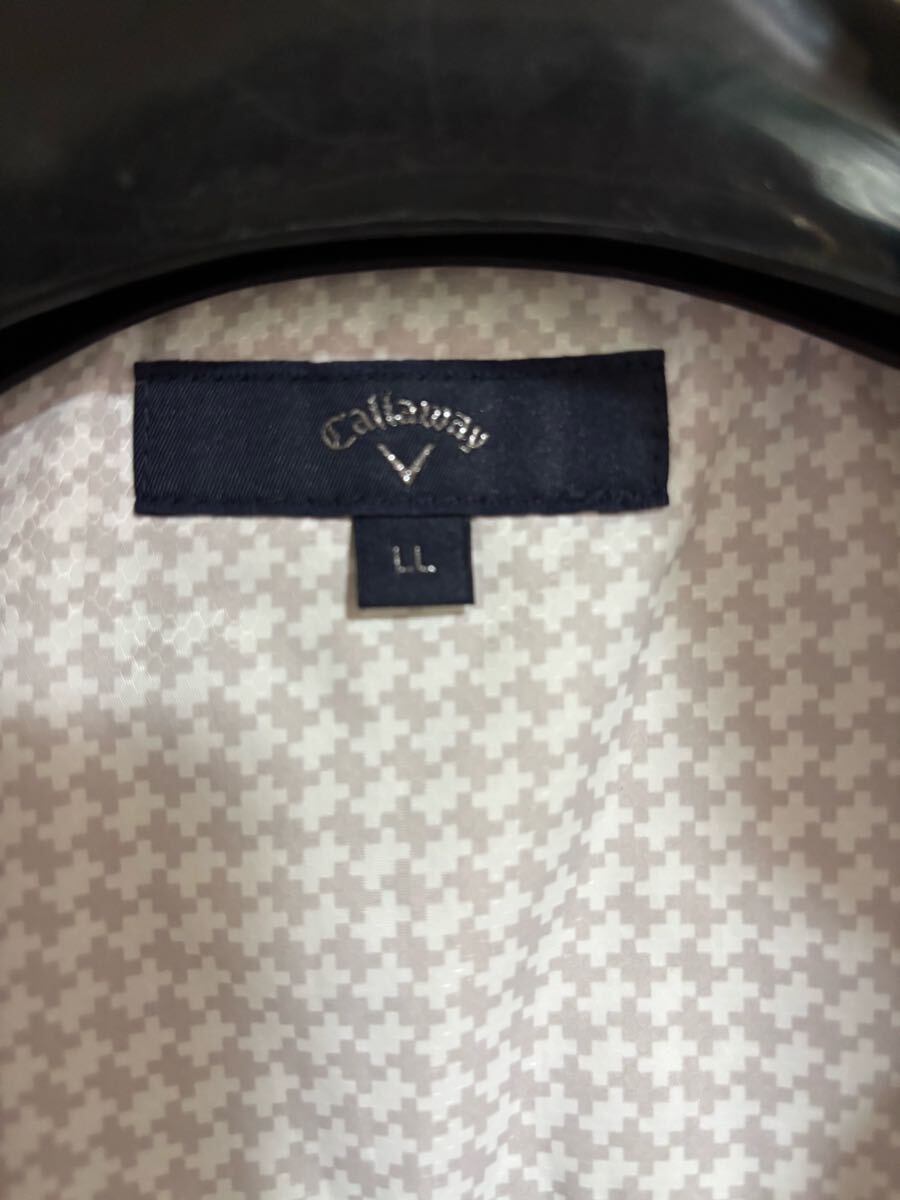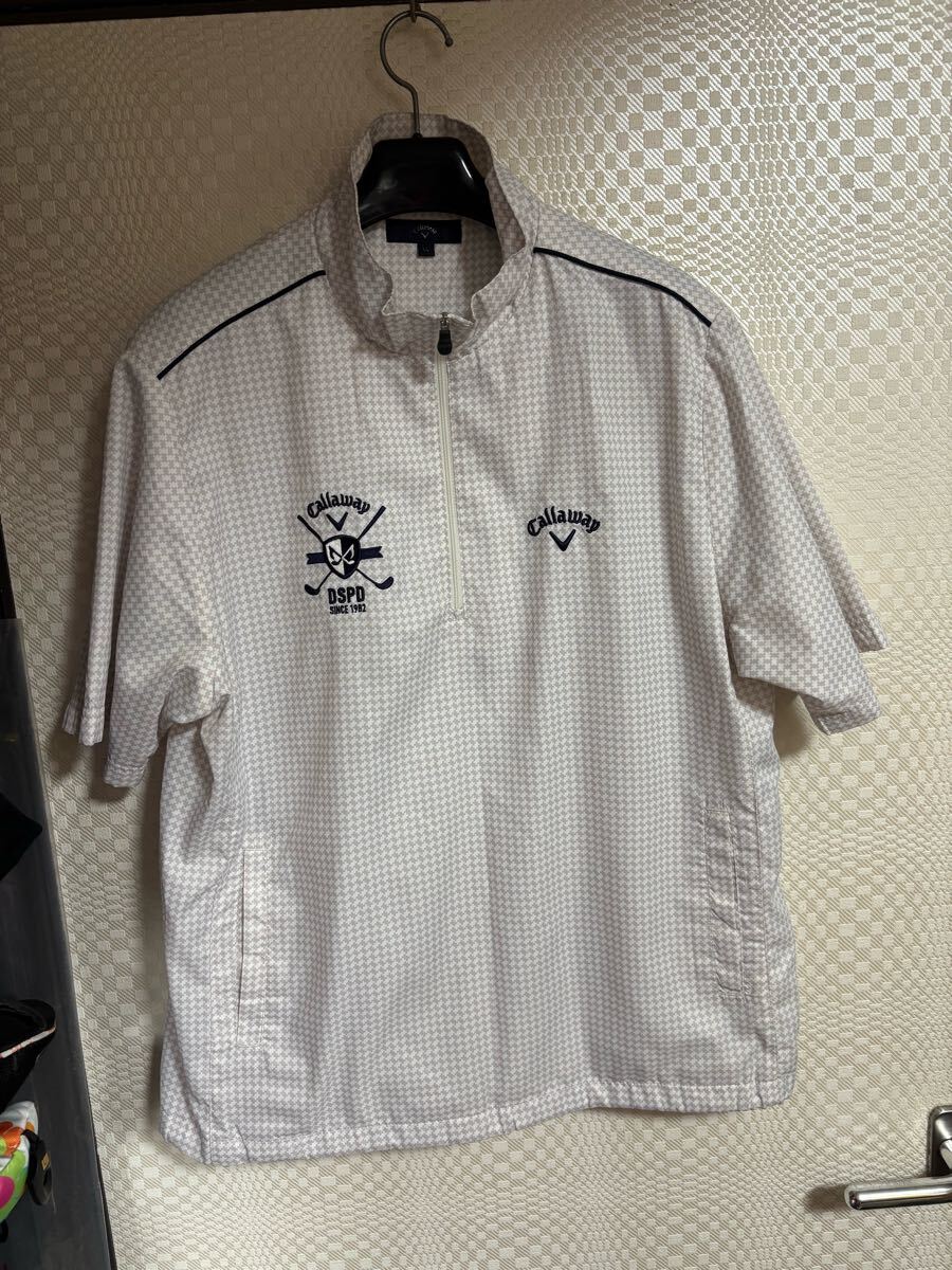 キャロウェイゴルフ半袖ハーフジップウインドプルオーバーです。中側はメッシュ生地の二重構造です。サイズ L L表記で平置き脇下身幅60着丈70肩幅47センチ位です。裾にドローコードが付いています。