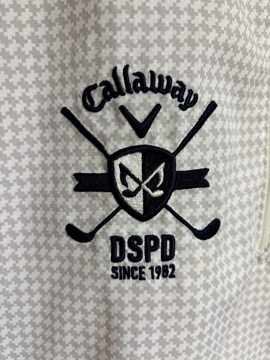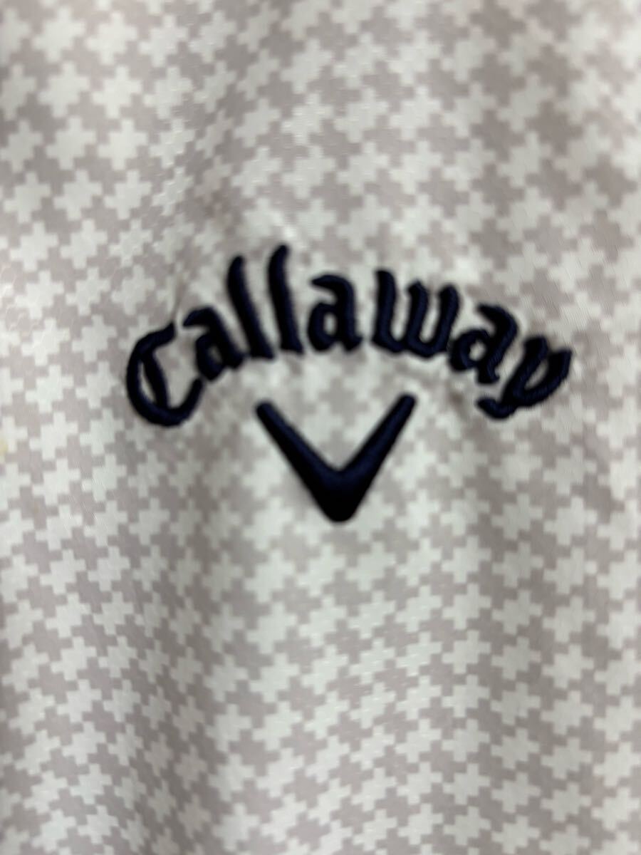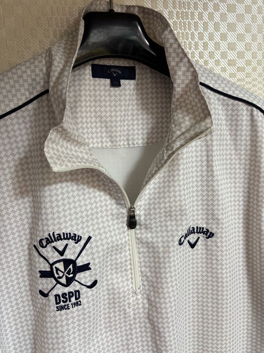 キャロウェイゴルフ半袖ハーフジップウインドプルオーバーです。中側はメッシュ生地の二重構造です。サイズ L L表記で平置き脇下身幅60着丈70肩幅47センチ位です。裾にドローコードが付いています。